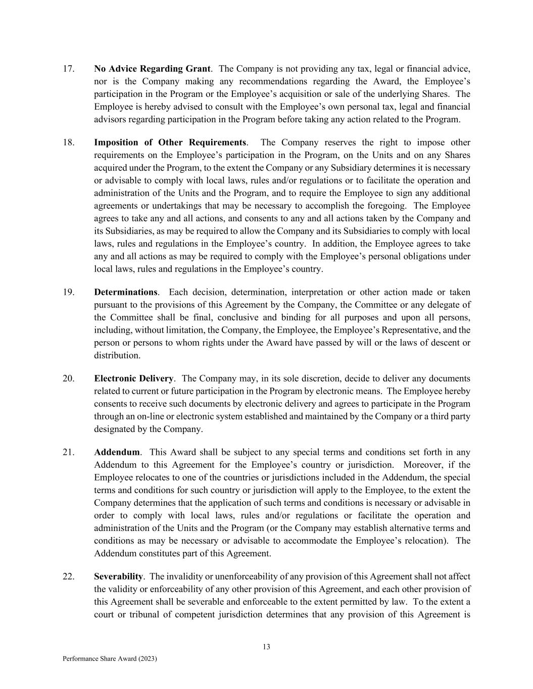 13 Performance Share Award (2023) 17. No Advice Regarding Grant. The Company is not providing any tax, legal or financial advice, nor is the Company making any recommendations regarding the Award, the Employee’s participation in the Program or the Employee’s acquisition or sale of the underlying Shares. The Employee is hereby advised to consult with the Employee’s own personal tax, legal and financial advisors regarding participation in the Program before taking any action related to the Program. 18. Imposition of Other Requirements. The Company reserves the right to impose other requirements on the Employee’s participation in the Program, on the Units and on any Shares acquired under the Program, to the extent the Company or any Subsidiary determines it is necessary or advisable to comply with local laws, rules and/or regulations or to facilitate the operation and administration of the Units and the Program, and to require the Employee to sign any additional agreements or undertakings that may be necessary to accomplish the foregoing. The Employee agrees to take any and all actions, and consents to any and all actions taken by the Company and its Subsidiaries, as may be required to allow the Company and its Subsidiaries to comply with local laws, rules and regulations in the Employee’s country. In addition, the Employee agrees to take any and all actions as may be required to comply with the Employee’s personal obligations under local laws, rules and regulations in the Employee’s country. 19. Determinations. Each decision, determination, interpretation or other action made or taken pursuant to the provisions of this Agreement by the Company, the Committee or any delegate of the Committee shall be final, conclusive and binding for all purposes and upon all persons, including, without limitation, the Company, the Employee, the Employee’s Representative, and the person or persons to whom rights under the Award have passed by will or the laws of descent or distribution. 20. Electronic Delivery. The Company may, in its sole discretion, decide to deliver any documents related to current or future participation in the Program by electronic means. The Employee hereby consents to receive such documents by electronic delivery and agrees to participate in the Program through an on-line or electronic system established and maintained by the Company or a third party designated by the Company. 21. Addendum. This Award shall be subject to any special terms and conditions set forth in any Addendum to this Agreement for the Employee’s country or jurisdiction. Moreover, if the Employee relocates to one of the countries or jurisdictions included in the Addendum, the special terms and conditions for such country or jurisdiction will apply to the Employee, to the extent the Company determines that the application of such terms and conditions is necessary or advisable in order to comply with local laws, rules and/or regulations or facilitate the operation and administration of the Units and the Program (or the Company may establish alternative terms and conditions as may be necessary or advisable to accommodate the Employee’s relocation). The Addendum constitutes part of this Agreement. 22. Severability. The invalidity or unenforceability of any provision of this Agreement shall not affect the validity or enforceability of any other provision of this Agreement, and each other provision of this Agreement shall be severable and enforceable to the extent permitted by law. To the extent a court or tribunal of competent jurisdiction determines that any provision of this Agreement is
