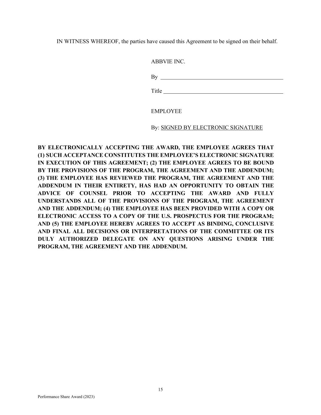 15 Performance Share Award (2023) IN WITNESS WHEREOF, the parties have caused this Agreement to be signed on their behalf. ABBVIE INC. By Title EMPLOYEE By: SIGNED BY ELECTRONIC SIGNATURE BY ELECTRONICALLY ACCEPTING THE AWARD, THE EMPLOYEE AGREES THAT (1) SUCH ACCEPTANCE CONSTITUTES THE EMPLOYEE’S ELECTRONIC SIGNATURE IN EXECUTION OF THIS AGREEMENT; (2) THE EMPLOYEE AGREES TO BE BOUND BY THE PROVISIONS OF THE PROGRAM, THE AGREEMENT AND THE ADDENDUM; (3) THE EMPLOYEE HAS REVIEWED THE PROGRAM, THE AGREEMENT AND THE ADDENDUM IN THEIR ENTIRETY, HAS HAD AN OPPORTUNITY TO OBTAIN THE ADVICE OF COUNSEL PRIOR TO ACCEPTING THE AWARD AND FULLY UNDERSTANDS ALL OF THE PROVISIONS OF THE PROGRAM, THE AGREEMENT AND THE ADDENDUM; (4) THE EMPLOYEE HAS BEEN PROVIDED WITH A COPY OR ELECTRONIC ACCESS TO A COPY OF THE U.S. PROSPECTUS FOR THE PROGRAM; AND (5) THE EMPLOYEE HEREBY AGREES TO ACCEPT AS BINDING, CONCLUSIVE AND FINAL ALL DECISIONS OR INTERPRETATIONS OF THE COMMITTEE OR ITS DULY AUTHORIZED DELEGATE ON ANY QUESTIONS ARISING UNDER THE PROGRAM, THE AGREEMENT AND THE ADDENDUM.