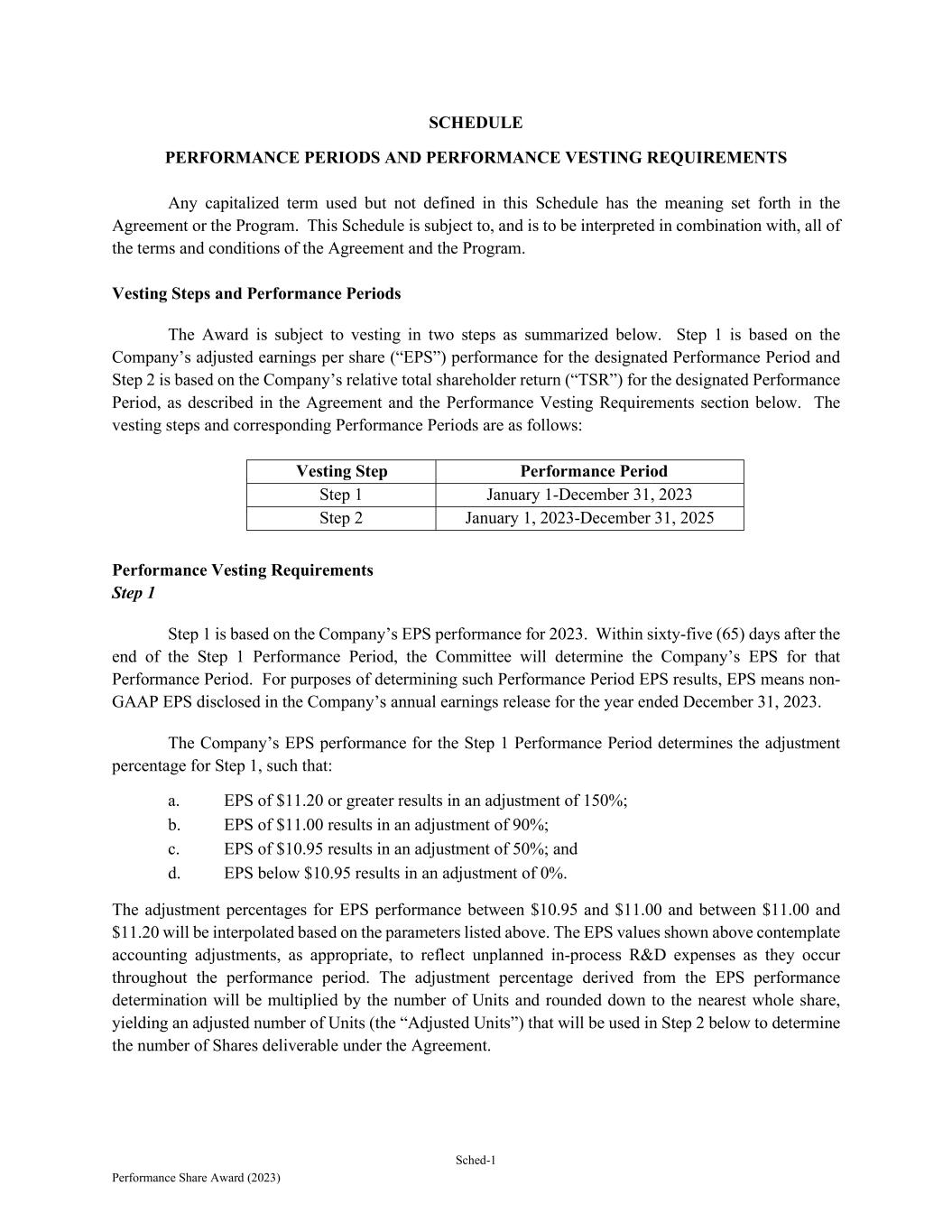 Sched-1 Performance Share Award (2023) SCHEDULE PERFORMANCE PERIODS AND PERFORMANCE VESTING REQUIREMENTS Any capitalized term used but not defined in this Schedule has the meaning set forth in the Agreement or the Program. This Schedule is subject to, and is to be interpreted in combination with, all of the terms and conditions of the Agreement and the Program. Vesting Steps and Performance Periods The Award is subject to vesting in two steps as summarized below. Step 1 is based on the Company’s adjusted earnings per share (“EPS”) performance for the designated Performance Period and Step 2 is based on the Company’s relative total shareholder return (“TSR”) for the designated Performance Period, as described in the Agreement and the Performance Vesting Requirements section below. The vesting steps and corresponding Performance Periods are as follows: Vesting Step Performance Period Step 1 January 1-December 31, 2023 Step 2 January 1, 2023-December 31, 2025 Performance Vesting Requirements Step 1 Step 1 is based on the Company’s EPS performance for 2023. Within sixty-five (65) days after the end of the Step 1 Performance Period, the Committee will determine the Company’s EPS for that Performance Period. For purposes of determining such Performance Period EPS results, EPS means non- GAAP EPS disclosed in the Company’s annual earnings release for the year ended December 31, 2023. The Company’s EPS performance for the Step 1 Performance Period determines the adjustment percentage for Step 1, such that: a. EPS of $11.20 or greater results in an adjustment of 150%; b. EPS of $11.00 results in an adjustment of 90%; c. EPS of $10.95 results in an adjustment of 50%; and d. EPS below $10.95 results in an adjustment of 0%. The adjustment percentages for EPS performance between $10.95 and $11.00 and between $11.00 and $11.20 will be interpolated based on the parameters listed above. The EPS values shown above contemplate accounting adjustments, as appropriate, to reflect unplanned in-process R&D expenses as they occur throughout the performance period. The adjustment percentage derived from the EPS performance determination will be multiplied by the number of Units and rounded down to the nearest whole share, yielding an adjusted number of Units (the “Adjusted Units”) that will be used in Step 2 below to determine the number of Shares deliverable under the Agreement.