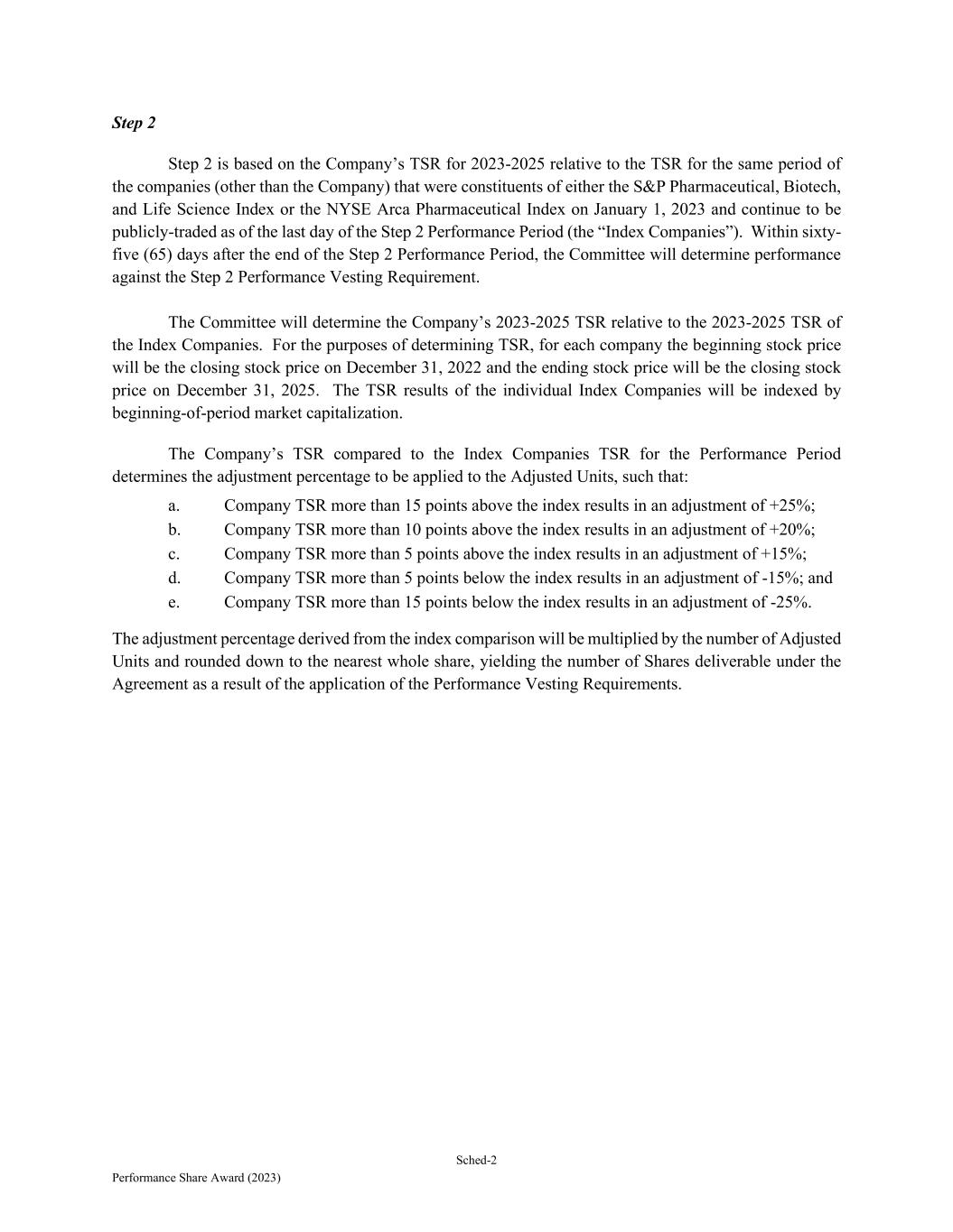 Sched-2 Performance Share Award (2023) Step 2 Step 2 is based on the Company’s TSR for 2023-2025 relative to the TSR for the same period of the companies (other than the Company) that were constituents of either the S&P Pharmaceutical, Biotech, and Life Science Index or the NYSE Arca Pharmaceutical Index on January 1, 2023 and continue to be publicly-traded as of the last day of the Step 2 Performance Period (the “Index Companies”). Within sixty- five (65) days after the end of the Step 2 Performance Period, the Committee will determine performance against the Step 2 Performance Vesting Requirement. The Committee will determine the Company’s 2023-2025 TSR relative to the 2023-2025 TSR of the Index Companies. For the purposes of determining TSR, for each company the beginning stock price will be the closing stock price on December 31, 2022 and the ending stock price will be the closing stock price on December 31, 2025. The TSR results of the individual Index Companies will be indexed by beginning-of-period market capitalization. The Company’s TSR compared to the Index Companies TSR for the Performance Period determines the adjustment percentage to be applied to the Adjusted Units, such that: a. Company TSR more than 15 points above the index results in an adjustment of +25%; b. Company TSR more than 10 points above the index results in an adjustment of +20%; c. Company TSR more than 5 points above the index results in an adjustment of +15%; d. Company TSR more than 5 points below the index results in an adjustment of -15%; and e. Company TSR more than 15 points below the index results in an adjustment of -25%. The adjustment percentage derived from the index comparison will be multiplied by the number of Adjusted Units and rounded down to the nearest whole share, yielding the number of Shares deliverable under the Agreement as a result of the application of the Performance Vesting Requirements.