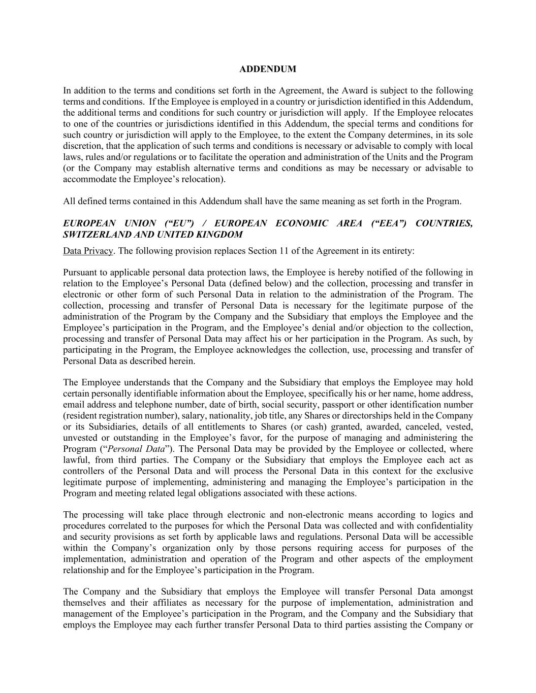ADDENDUM In addition to the terms and conditions set forth in the Agreement, the Award is subject to the following terms and conditions. If the Employee is employed in a country or jurisdiction identified in this Addendum, the additional terms and conditions for such country or jurisdiction will apply. If the Employee relocates to one of the countries or jurisdictions identified in this Addendum, the special terms and conditions for such country or jurisdiction will apply to the Employee, to the extent the Company determines, in its sole discretion, that the application of such terms and conditions is necessary or advisable to comply with local laws, rules and/or regulations or to facilitate the operation and administration of the Units and the Program (or the Company may establish alternative terms and conditions as may be necessary or advisable to accommodate the Employee’s relocation). All defined terms contained in this Addendum shall have the same meaning as set forth in the Program. EUROPEAN UNION (“EU”) / EUROPEAN ECONOMIC AREA (“EEA”) COUNTRIES, SWITZERLAND AND UNITED KINGDOM Data Privacy. The following provision replaces Section 11 of the Agreement in its entirety: Pursuant to applicable personal data protection laws, the Employee is hereby notified of the following in relation to the Employee’s Personal Data (defined below) and the collection, processing and transfer in electronic or other form of such Personal Data in relation to the administration of the Program. The collection, processing and transfer of Personal Data is necessary for the legitimate purpose of the administration of the Program by the Company and the Subsidiary that employs the Employee and the Employee’s participation in the Program, and the Employee’s denial and/or objection to the collection, processing and transfer of Personal Data may affect his or her participation in the Program. As such, by participating in the Program, the Employee acknowledges the collection, use, processing and transfer of Personal Data as described herein. The Employee understands that the Company and the Subsidiary that employs the Employee may hold certain personally identifiable information about the Employee, specifically his or her name, home address, email address and telephone number, date of birth, social security, passport or other identification number (resident registration number), salary, nationality, job title, any Shares or directorships held in the Company or its Subsidiaries, details of all entitlements to Shares (or cash) granted, awarded, canceled, vested, unvested or outstanding in the Employee’s favor, for the purpose of managing and administering the Program (“Personal Data”). The Personal Data may be provided by the Employee or collected, where lawful, from third parties. The Company or the Subsidiary that employs the Employee each act as controllers of the Personal Data and will process the Personal Data in this context for the exclusive legitimate purpose of implementing, administering and managing the Employee’s participation in the Program and meeting related legal obligations associated with these actions. The processing will take place through electronic and non-electronic means according to logics and procedures correlated to the purposes for which the Personal Data was collected and with confidentiality and security provisions as set forth by applicable laws and regulations. Personal Data will be accessible within the Company’s organization only by those persons requiring access for purposes of the implementation, administration and operation of the Program and other aspects of the employment relationship and for the Employee’s participation in the Program. The Company and the Subsidiary that employs the Employee will transfer Personal Data amongst themselves and their affiliates as necessary for the purpose of implementation, administration and management of the Employee’s participation in the Program, and the Company and the Subsidiary that employs the Employee may each further transfer Personal Data to third parties assisting the Company or