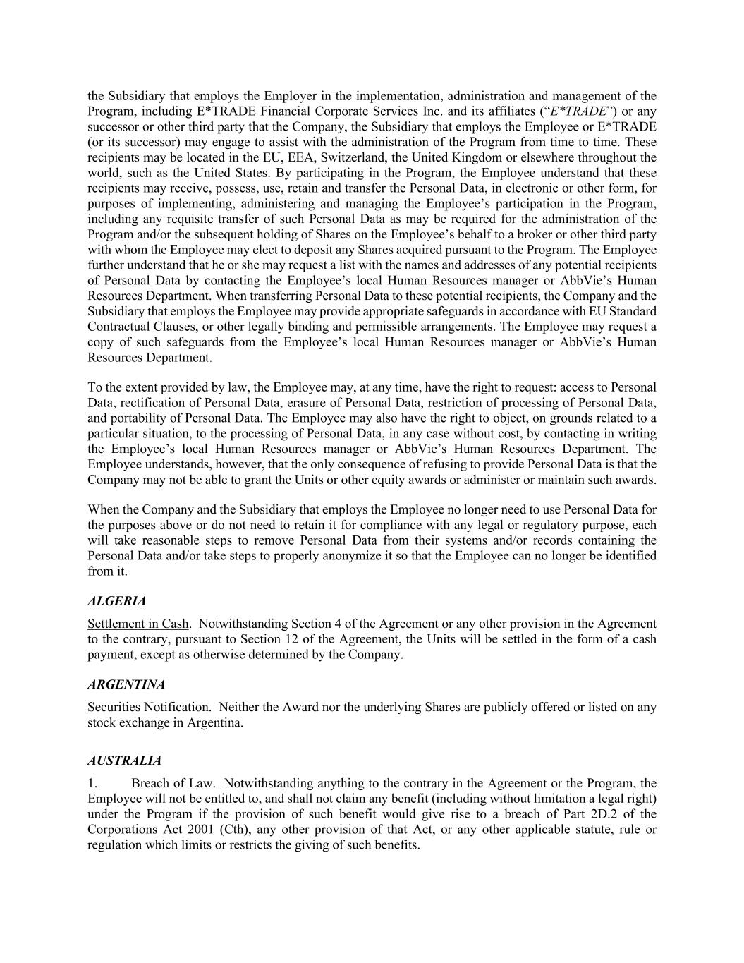 the Subsidiary that employs the Employer in the implementation, administration and management of the Program, including E*TRADE Financial Corporate Services Inc. and its affiliates (“E*TRADE”) or any successor or other third party that the Company, the Subsidiary that employs the Employee or E*TRADE (or its successor) may engage to assist with the administration of the Program from time to time. These recipients may be located in the EU, EEA, Switzerland, the United Kingdom or elsewhere throughout the world, such as the United States. By participating in the Program, the Employee understand that these recipients may receive, possess, use, retain and transfer the Personal Data, in electronic or other form, for purposes of implementing, administering and managing the Employee’s participation in the Program, including any requisite transfer of such Personal Data as may be required for the administration of the Program and/or the subsequent holding of Shares on the Employee’s behalf to a broker or other third party with whom the Employee may elect to deposit any Shares acquired pursuant to the Program. The Employee further understand that he or she may request a list with the names and addresses of any potential recipients of Personal Data by contacting the Employee’s local Human Resources manager or AbbVie’s Human Resources Department. When transferring Personal Data to these potential recipients, the Company and the Subsidiary that employs the Employee may provide appropriate safeguards in accordance with EU Standard Contractual Clauses, or other legally binding and permissible arrangements. The Employee may request a copy of such safeguards from the Employee’s local Human Resources manager or AbbVie’s Human Resources Department. To the extent provided by law, the Employee may, at any time, have the right to request: access to Personal Data, rectification of Personal Data, erasure of Personal Data, restriction of processing of Personal Data, and portability of Personal Data. The Employee may also have the right to object, on grounds related to a particular situation, to the processing of Personal Data, in any case without cost, by contacting in writing the Employee’s local Human Resources manager or AbbVie’s Human Resources Department. The Employee understands, however, that the only consequence of refusing to provide Personal Data is that the Company may not be able to grant the Units or other equity awards or administer or maintain such awards. When the Company and the Subsidiary that employs the Employee no longer need to use Personal Data for the purposes above or do not need to retain it for compliance with any legal or regulatory purpose, each will take reasonable steps to remove Personal Data from their systems and/or records containing the Personal Data and/or take steps to properly anonymize it so that the Employee can no longer be identified from it. ALGERIA Settlement in Cash. Notwithstanding Section 4 of the Agreement or any other provision in the Agreement to the contrary, pursuant to Section 12 of the Agreement, the Units will be settled in the form of a cash payment, except as otherwise determined by the Company. ARGENTINA Securities Notification. Neither the Award nor the underlying Shares are publicly offered or listed on any stock exchange in Argentina. AUSTRALIA 1. Breach of Law. Notwithstanding anything to the contrary in the Agreement or the Program, the Employee will not be entitled to, and shall not claim any benefit (including without limitation a legal right) under the Program if the provision of such benefit would give rise to a breach of Part 2D.2 of the Corporations Act 2001 (Cth), any other provision of that Act, or any other applicable statute, rule or regulation which limits or restricts the giving of such benefits.