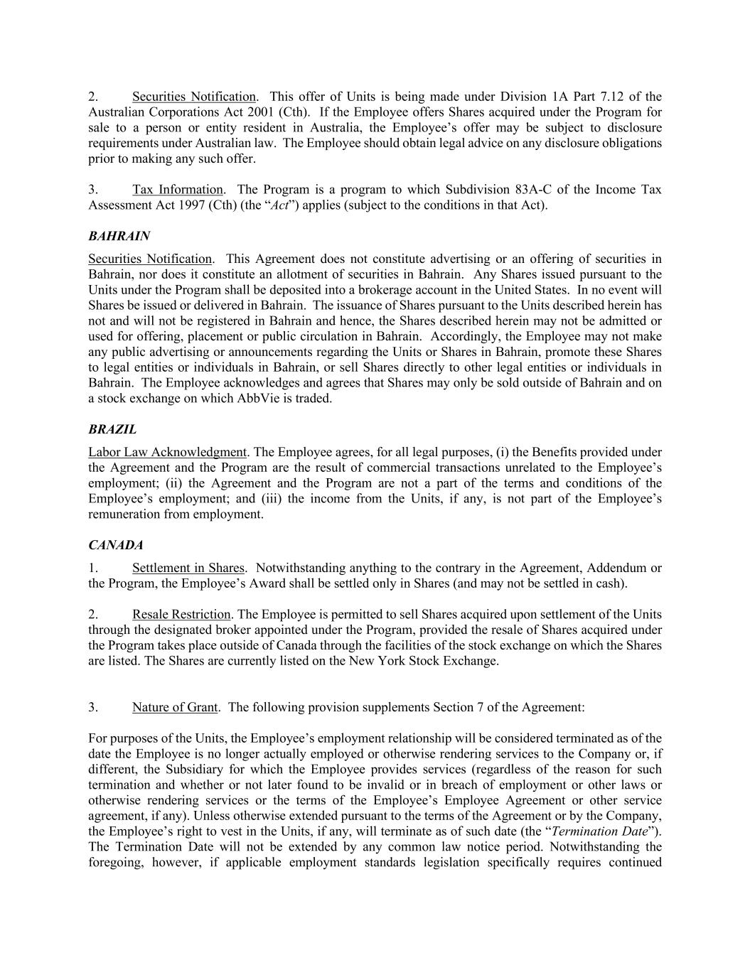 2. Securities Notification. This offer of Units is being made under Division 1A Part 7.12 of the Australian Corporations Act 2001 (Cth). If the Employee offers Shares acquired under the Program for sale to a person or entity resident in Australia, the Employee’s offer may be subject to disclosure requirements under Australian law. The Employee should obtain legal advice on any disclosure obligations prior to making any such offer. 3. Tax Information. The Program is a program to which Subdivision 83A-C of the Income Tax Assessment Act 1997 (Cth) (the “Act”) applies (subject to the conditions in that Act). BAHRAIN Securities Notification. This Agreement does not constitute advertising or an offering of securities in Bahrain, nor does it constitute an allotment of securities in Bahrain. Any Shares issued pursuant to the Units under the Program shall be deposited into a brokerage account in the United States. In no event will Shares be issued or delivered in Bahrain. The issuance of Shares pursuant to the Units described herein has not and will not be registered in Bahrain and hence, the Shares described herein may not be admitted or used for offering, placement or public circulation in Bahrain. Accordingly, the Employee may not make any public advertising or announcements regarding the Units or Shares in Bahrain, promote these Shares to legal entities or individuals in Bahrain, or sell Shares directly to other legal entities or individuals in Bahrain. The Employee acknowledges and agrees that Shares may only be sold outside of Bahrain and on a stock exchange on which AbbVie is traded. BRAZIL Labor Law Acknowledgment. The Employee agrees, for all legal purposes, (i) the Benefits provided under the Agreement and the Program are the result of commercial transactions unrelated to the Employee’s employment; (ii) the Agreement and the Program are not a part of the terms and conditions of the Employee’s employment; and (iii) the income from the Units, if any, is not part of the Employee’s remuneration from employment. CANADA 1. Settlement in Shares. Notwithstanding anything to the contrary in the Agreement, Addendum or the Program, the Employee’s Award shall be settled only in Shares (and may not be settled in cash). 2. Resale Restriction. The Employee is permitted to sell Shares acquired upon settlement of the Units through the designated broker appointed under the Program, provided the resale of Shares acquired under the Program takes place outside of Canada through the facilities of the stock exchange on which the Shares are listed. The Shares are currently listed on the New York Stock Exchange. 3. Nature of Grant. The following provision supplements Section 7 of the Agreement: For purposes of the Units, the Employee’s employment relationship will be considered terminated as of the date the Employee is no longer actually employed or otherwise rendering services to the Company or, if different, the Subsidiary for which the Employee provides services (regardless of the reason for such termination and whether or not later found to be invalid or in breach of employment or other laws or otherwise rendering services or the terms of the Employee’s Employee Agreement or other service agreement, if any). Unless otherwise extended pursuant to the terms of the Agreement or by the Company, the Employee’s right to vest in the Units, if any, will terminate as of such date (the “Termination Date”). The Termination Date will not be extended by any common law notice period. Notwithstanding the foregoing, however, if applicable employment standards legislation specifically requires continued