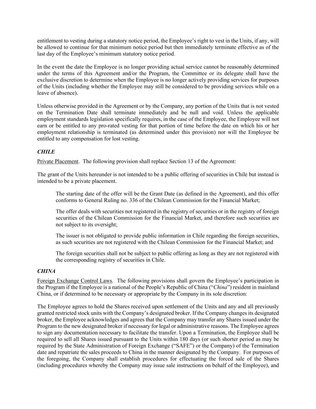 entitlement to vesting during a statutory notice period, the Employee’s right to vest in the Units, if any, will be allowed to continue for that minimum notice period but then immediately terminate effective as of the last day of the Employee’s minimum statutory notice period. In the event the date the Employee is no longer providing actual service cannot be reasonably determined under the terms of this Agreement and/or the Program, the Committee or its delegate shall have the exclusive discretion to determine when the Employee is no longer actively providing services for purposes of the Units (including whether the Employee may still be considered to be providing services while on a leave of absence). Unless otherwise provided in the Agreement or by the Company, any portion of the Units that is not vested on the Termination Date shall terminate immediately and be null and void. Unless the applicable employment standards legislation specifically requires, in the case of the Employee, the Employee will not earn or be entitled to any pro-rated vesting for that portion of time before the date on which his or her employment relationship is terminated (as determined under this provision) nor will the Employee be entitled to any compensation for lost vesting. CHILE Private Placement. The following provision shall replace Section 13 of the Agreement: The grant of the Units hereunder is not intended to be a public offering of securities in Chile but instead is intended to be a private placement. The starting date of the offer will be the Grant Date (as defined in the Agreement), and this offer conforms to General Ruling no. 336 of the Chilean Commission for the Financial Market; The offer deals with securities not registered in the registry of securities or in the registry of foreign securities of the Chilean Commission for the Financial Market, and therefore such securities are not subject to its oversight; The issuer is not obligated to provide public information in Chile regarding the foreign securities, as such securities are not registered with the Chilean Commission for the Financial Market; and The foreign securities shall not be subject to public offering as long as they are not registered with the corresponding registry of securities in Chile. CHINA Foreign Exchange Control Laws. The following provisions shall govern the Employee’s participation in the Program if the Employee is a national of the People’s Republic of China (“China”) resident in mainland China, or if determined to be necessary or appropriate by the Company in its sole discretion: The Employee agrees to hold the Shares received upon settlement of the Units and any and all previously granted restricted stock units with the Company’s designated broker. If the Company changes its designated broker, the Employee acknowledges and agrees that the Company may transfer any Shares issued under the Program to the new designated broker if necessary for legal or administrative reasons. The Employee agrees to sign any documentation necessary to facilitate the transfer. Upon a Termination, the Employee shall be required to sell all Shares issued pursuant to the Units within 180 days (or such shorter period as may be required by the State Administration of Foreign Exchange (“SAFE”) or the Company) of the Termination date and repatriate the sales proceeds to China in the manner designated by the Company. For purposes of the foregoing, the Company shall establish procedures for effectuating the forced sale of the Shares (including procedures whereby the Company may issue sale instructions on behalf of the Employee), and