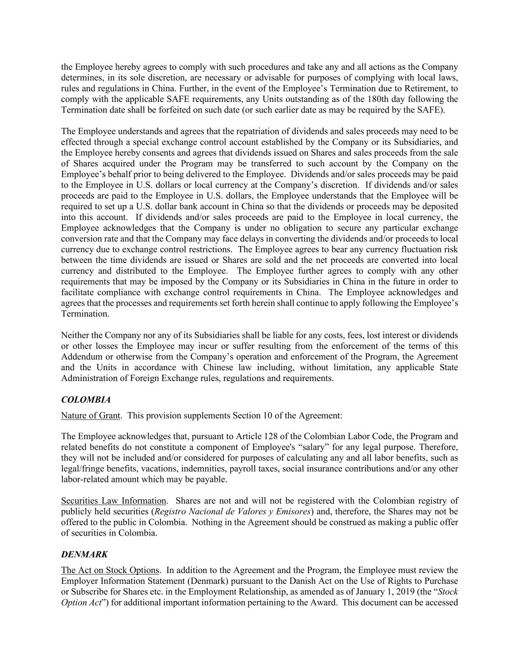 the Employee hereby agrees to comply with such procedures and take any and all actions as the Company determines, in its sole discretion, are necessary or advisable for purposes of complying with local laws, rules and regulations in China. Further, in the event of the Employee’s Termination due to Retirement, to comply with the applicable SAFE requirements, any Units outstanding as of the 180th day following the Termination date shall be forfeited on such date (or such earlier date as may be required by the SAFE). The Employee understands and agrees that the repatriation of dividends and sales proceeds may need to be effected through a special exchange control account established by the Company or its Subsidiaries, and the Employee hereby consents and agrees that dividends issued on Shares and sales proceeds from the sale of Shares acquired under the Program may be transferred to such account by the Company on the Employee’s behalf prior to being delivered to the Employee. Dividends and/or sales proceeds may be paid to the Employee in U.S. dollars or local currency at the Company’s discretion. If dividends and/or sales proceeds are paid to the Employee in U.S. dollars, the Employee understands that the Employee will be required to set up a U.S. dollar bank account in China so that the dividends or proceeds may be deposited into this account. If dividends and/or sales proceeds are paid to the Employee in local currency, the Employee acknowledges that the Company is under no obligation to secure any particular exchange conversion rate and that the Company may face delays in converting the dividends and/or proceeds to local currency due to exchange control restrictions. The Employee agrees to bear any currency fluctuation risk between the time dividends are issued or Shares are sold and the net proceeds are converted into local currency and distributed to the Employee. The Employee further agrees to comply with any other requirements that may be imposed by the Company or its Subsidiaries in China in the future in order to facilitate compliance with exchange control requirements in China. The Employee acknowledges and agrees that the processes and requirements set forth herein shall continue to apply following the Employee’s Termination. Neither the Company nor any of its Subsidiaries shall be liable for any costs, fees, lost interest or dividends or other losses the Employee may incur or suffer resulting from the enforcement of the terms of this Addendum or otherwise from the Company’s operation and enforcement of the Program, the Agreement and the Units in accordance with Chinese law including, without limitation, any applicable State Administration of Foreign Exchange rules, regulations and requirements. COLOMBIA Nature of Grant. This provision supplements Section 10 of the Agreement: The Employee acknowledges that, pursuant to Article 128 of the Colombian Labor Code, the Program and related benefits do not constitute a component of Employee's “salary” for any legal purpose. Therefore, they will not be included and/or considered for purposes of calculating any and all labor benefits, such as legal/fringe benefits, vacations, indemnities, payroll taxes, social insurance contributions and/or any other labor-related amount which may be payable. Securities Law Information. Shares are not and will not be registered with the Colombian registry of publicly held securities (Registro Nacional de Valores y Emisores) and, therefore, the Shares may not be offered to the public in Colombia. Nothing in the Agreement should be construed as making a public offer of securities in Colombia. DENMARK The Act on Stock Options. In addition to the Agreement and the Program, the Employee must review the Employer Information Statement (Denmark) pursuant to the Danish Act on the Use of Rights to Purchase or Subscribe for Shares etc. in the Employment Relationship, as amended as of January 1, 2019 (the “Stock Option Act”) for additional important information pertaining to the Award. This document can be accessed