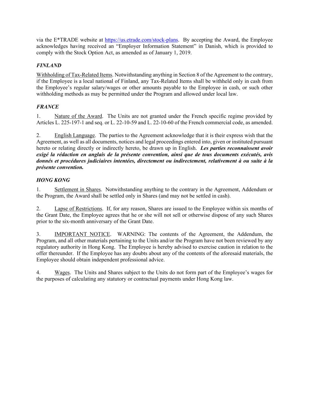 via the E*TRADE website at https://us.etrade.com/stock-plans. By accepting the Award, the Employee acknowledges having received an “Employer Information Statement” in Danish, which is provided to comply with the Stock Option Act, as amended as of January 1, 2019. FINLAND Withholding of Tax-Related Items. Notwithstanding anything in Section 8 of the Agreement to the contrary, if the Employee is a local national of Finland, any Tax-Related Items shall be withheld only in cash from the Employee’s regular salary/wages or other amounts payable to the Employee in cash, or such other withholding methods as may be permitted under the Program and allowed under local law. FRANCE 1. Nature of the Award. The Units are not granted under the French specific regime provided by Articles L. 225-197-1 and seq. or L. 22-10-59 and L. 22-10-60 of the French commercial code, as amended. 2. English Language. The parties to the Agreement acknowledge that it is their express wish that the Agreement, as well as all documents, notices and legal proceedings entered into, given or instituted pursuant hereto or relating directly or indirectly hereto, be drawn up in English. Les parties reconnaissent avoir exigé la rédaction en anglais de la présente convention, ainsi que de tous documents exécutés, avis donnés et procédures judiciaires intentées, directement ou indirectement, relativement à ou suite à la présente convention. HONG KONG 1. Settlement in Shares. Notwithstanding anything to the contrary in the Agreement, Addendum or the Program, the Award shall be settled only in Shares (and may not be settled in cash). 2. Lapse of Restrictions. If, for any reason, Shares are issued to the Employee within six months of the Grant Date, the Employee agrees that he or she will not sell or otherwise dispose of any such Shares prior to the six-month anniversary of the Grant Date. 3. IMPORTANT NOTICE. WARNING: The contents of the Agreement, the Addendum, the Program, and all other materials pertaining to the Units and/or the Program have not been reviewed by any regulatory authority in Hong Kong. The Employee is hereby advised to exercise caution in relation to the offer thereunder. If the Employee has any doubts about any of the contents of the aforesaid materials, the Employee should obtain independent professional advice. 4. Wages. The Units and Shares subject to the Units do not form part of the Employee’s wages for the purposes of calculating any statutory or contractual payments under Hong Kong law.