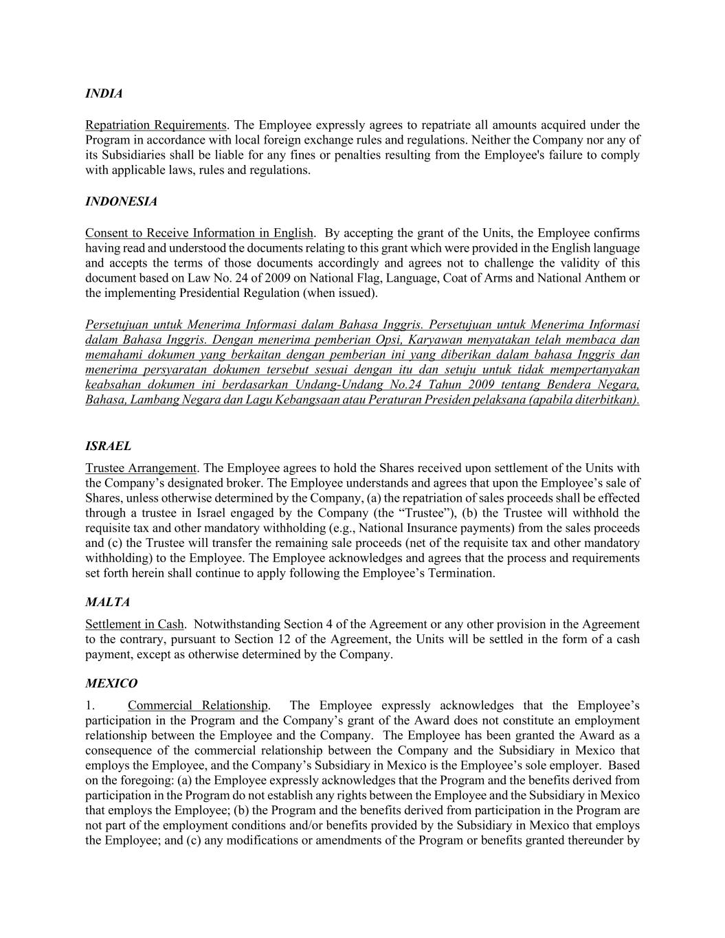 INDIA Repatriation Requirements. The Employee expressly agrees to repatriate all amounts acquired under the Program in accordance with local foreign exchange rules and regulations. Neither the Company nor any of its Subsidiaries shall be liable for any fines or penalties resulting from the Employee's failure to comply with applicable laws, rules and regulations. INDONESIA Consent to Receive Information in English. By accepting the grant of the Units, the Employee confirms having read and understood the documents relating to this grant which were provided in the English language and accepts the terms of those documents accordingly and agrees not to challenge the validity of this document based on Law No. 24 of 2009 on National Flag, Language, Coat of Arms and National Anthem or the implementing Presidential Regulation (when issued). Persetujuan untuk Menerima Informasi dalam Bahasa Inggris. Persetujuan untuk Menerima Informasi dalam Bahasa Inggris. Dengan menerima pemberian Opsi, Karyawan menyatakan telah membaca dan memahami dokumen yang berkaitan dengan pemberian ini yang diberikan dalam bahasa Inggris dan menerima persyaratan dokumen tersebut sesuai dengan itu dan setuju untuk tidak mempertanyakan keabsahan dokumen ini berdasarkan Undang-Undang No.24 Tahun 2009 tentang Bendera Negara, Bahasa, Lambang Negara dan Lagu Kebangsaan atau Peraturan Presiden pelaksana (apabila diterbitkan). ISRAEL Trustee Arrangement. The Employee agrees to hold the Shares received upon settlement of the Units with the Company’s designated broker. The Employee understands and agrees that upon the Employee’s sale of Shares, unless otherwise determined by the Company, (a) the repatriation of sales proceeds shall be effected through a trustee in Israel engaged by the Company (the “Trustee”), (b) the Trustee will withhold the requisite tax and other mandatory withholding (e.g., National Insurance payments) from the sales proceeds and (c) the Trustee will transfer the remaining sale proceeds (net of the requisite tax and other mandatory withholding) to the Employee. The Employee acknowledges and agrees that the process and requirements set forth herein shall continue to apply following the Employee’s Termination. MALTA Settlement in Cash. Notwithstanding Section 4 of the Agreement or any other provision in the Agreement to the contrary, pursuant to Section 12 of the Agreement, the Units will be settled in the form of a cash payment, except as otherwise determined by the Company. MEXICO 1. Commercial Relationship. The Employee expressly acknowledges that the Employee’s participation in the Program and the Company’s grant of the Award does not constitute an employment relationship between the Employee and the Company. The Employee has been granted the Award as a consequence of the commercial relationship between the Company and the Subsidiary in Mexico that employs the Employee, and the Company’s Subsidiary in Mexico is the Employee’s sole employer. Based on the foregoing: (a) the Employee expressly acknowledges that the Program and the benefits derived from participation in the Program do not establish any rights between the Employee and the Subsidiary in Mexico that employs the Employee; (b) the Program and the benefits derived from participation in the Program are not part of the employment conditions and/or benefits provided by the Subsidiary in Mexico that employs the Employee; and (c) any modifications or amendments of the Program or benefits granted thereunder by