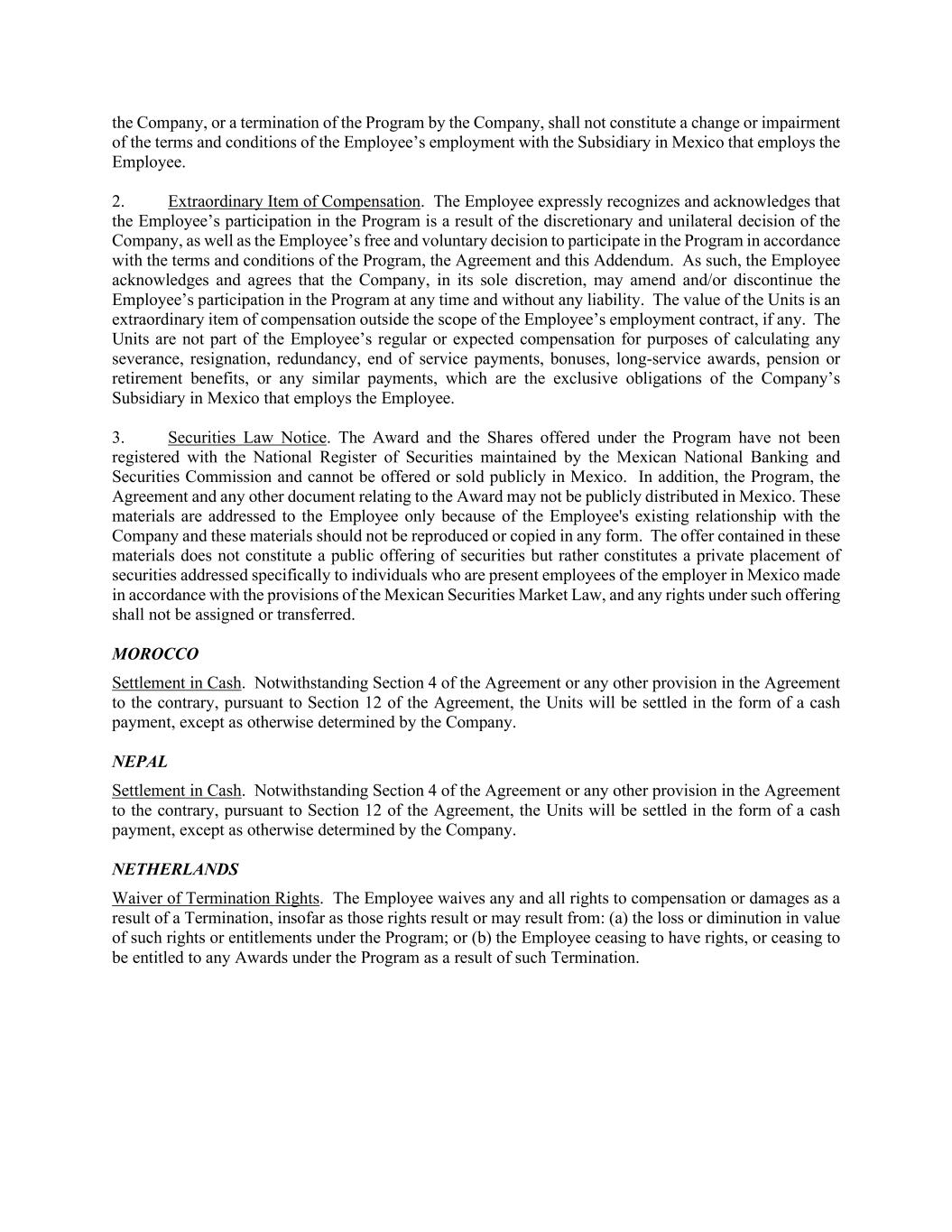 the Company, or a termination of the Program by the Company, shall not constitute a change or impairment of the terms and conditions of the Employee’s employment with the Subsidiary in Mexico that employs the Employee. 2. Extraordinary Item of Compensation. The Employee expressly recognizes and acknowledges that the Employee’s participation in the Program is a result of the discretionary and unilateral decision of the Company, as well as the Employee’s free and voluntary decision to participate in the Program in accordance with the terms and conditions of the Program, the Agreement and this Addendum. As such, the Employee acknowledges and agrees that the Company, in its sole discretion, may amend and/or discontinue the Employee’s participation in the Program at any time and without any liability. The value of the Units is an extraordinary item of compensation outside the scope of the Employee’s employment contract, if any. The Units are not part of the Employee’s regular or expected compensation for purposes of calculating any severance, resignation, redundancy, end of service payments, bonuses, long-service awards, pension or retirement benefits, or any similar payments, which are the exclusive obligations of the Company’s Subsidiary in Mexico that employs the Employee. 3. Securities Law Notice. The Award and the Shares offered under the Program have not been registered with the National Register of Securities maintained by the Mexican National Banking and Securities Commission and cannot be offered or sold publicly in Mexico. In addition, the Program, the Agreement and any other document relating to the Award may not be publicly distributed in Mexico. These materials are addressed to the Employee only because of the Employee's existing relationship with the Company and these materials should not be reproduced or copied in any form. The offer contained in these materials does not constitute a public offering of securities but rather constitutes a private placement of securities addressed specifically to individuals who are present employees of the employer in Mexico made in accordance with the provisions of the Mexican Securities Market Law, and any rights under such offering shall not be assigned or transferred. MOROCCO Settlement in Cash. Notwithstanding Section 4 of the Agreement or any other provision in the Agreement to the contrary, pursuant to Section 12 of the Agreement, the Units will be settled in the form of a cash payment, except as otherwise determined by the Company. NEPAL Settlement in Cash. Notwithstanding Section 4 of the Agreement or any other provision in the Agreement to the contrary, pursuant to Section 12 of the Agreement, the Units will be settled in the form of a cash payment, except as otherwise determined by the Company. NETHERLANDS Waiver of Termination Rights. The Employee waives any and all rights to compensation or damages as a result of a Termination, insofar as those rights result or may result from: (a) the loss or diminution in value of such rights or entitlements under the Program; or (b) the Employee ceasing to have rights, or ceasing to be entitled to any Awards under the Program as a result of such Termination.