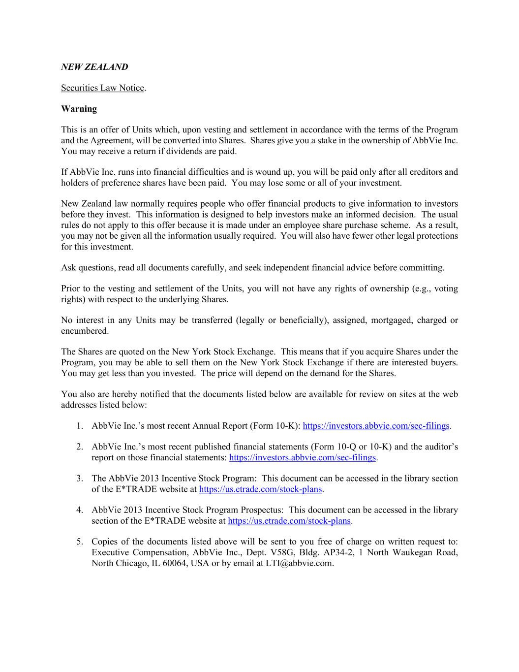 NEW ZEALAND Securities Law Notice. Warning This is an offer of Units which, upon vesting and settlement in accordance with the terms of the Program and the Agreement, will be converted into Shares. Shares give you a stake in the ownership of AbbVie Inc. You may receive a return if dividends are paid. If AbbVie Inc. runs into financial difficulties and is wound up, you will be paid only after all creditors and holders of preference shares have been paid. You may lose some or all of your investment. New Zealand law normally requires people who offer financial products to give information to investors before they invest. This information is designed to help investors make an informed decision. The usual rules do not apply to this offer because it is made under an employee share purchase scheme. As a result, you may not be given all the information usually required. You will also have fewer other legal protections for this investment. Ask questions, read all documents carefully, and seek independent financial advice before committing. Prior to the vesting and settlement of the Units, you will not have any rights of ownership (e.g., voting rights) with respect to the underlying Shares. No interest in any Units may be transferred (legally or beneficially), assigned, mortgaged, charged or encumbered. The Shares are quoted on the New York Stock Exchange. This means that if you acquire Shares under the Program, you may be able to sell them on the New York Stock Exchange if there are interested buyers. You may get less than you invested. The price will depend on the demand for the Shares. You also are hereby notified that the documents listed below are available for review on sites at the web addresses listed below: 1. AbbVie Inc.’s most recent Annual Report (Form 10-K): https://investors.abbvie.com/sec-filings. 2. AbbVie Inc.’s most recent published financial statements (Form 10-Q or 10-K) and the auditor’s report on those financial statements: https://investors.abbvie.com/sec-filings. 3. The AbbVie 2013 Incentive Stock Program: This document can be accessed in the library section of the E*TRADE website at https://us.etrade.com/stock-plans. 4. AbbVie 2013 Incentive Stock Program Prospectus: This document can be accessed in the library section of the E*TRADE website at https://us.etrade.com/stock-plans. 5. Copies of the documents listed above will be sent to you free of charge on written request to: Executive Compensation, AbbVie Inc., Dept. V58G, Bldg. AP34-2, 1 North Waukegan Road, North Chicago, IL 60064, USA or by email at LTI@abbvie.com.