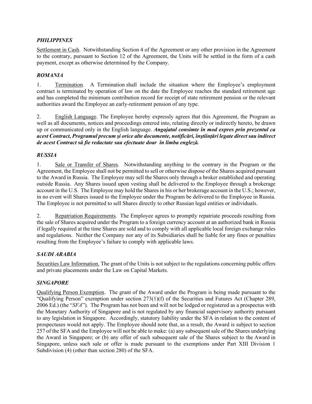PHILIPPINES Settlement in Cash. Notwithstanding Section 4 of the Agreement or any other provision in the Agreement to the contrary, pursuant to Section 12 of the Agreement, the Units will be settled in the form of a cash payment, except as otherwise determined by the Company. ROMANIA 1. Termination. A Termination shall include the situation where the Employee’s employment contract is terminated by operation of law on the date the Employee reaches the standard retirement age and has completed the minimum contribution record for receipt of state retirement pension or the relevant authorities award the Employee an early-retirement pension of any type. 2. English Language. The Employee hereby expressly agrees that this Agreement, the Program as well as all documents, notices and proceedings entered into, relating directly or indirectly hereto, be drawn up or communicated only in the English language. Angajatul consimte în mod expres prin prezentul ca acest Contract, Programul precum şi orice alte documente, notificări, înştiinţări legate direct sau indirect de acest Contract să fie redactate sau efectuate doar în limba engleză. RUSSIA 1. Sale or Transfer of Shares. Notwithstanding anything to the contrary in the Program or the Agreement, the Employee shall not be permitted to sell or otherwise dispose of the Shares acquired pursuant to the Award in Russia. The Employee may sell the Shares only through a broker established and operating outside Russia. Any Shares issued upon vesting shall be delivered to the Employee through a brokerage account in the U.S. The Employee may hold the Shares in his or her brokerage account in the U.S.; however, in no event will Shares issued to the Employee under the Program be delivered to the Employee in Russia. The Employee is not permitted to sell Shares directly to other Russian legal entities or individuals. 2. Repatriation Requirements. The Employee agrees to promptly repatriate proceeds resulting from the sale of Shares acquired under the Program to a foreign currency account at an authorized bank in Russia if legally required at the time Shares are sold and to comply with all applicable local foreign exchange rules and regulations. Neither the Company nor any of its Subsidiaries shall be liable for any fines or penalties resulting from the Employee’s failure to comply with applicable laws. SAUDI ARABIA Securities Law Information. The grant of the Units is not subject to the regulations concerning public offers and private placements under the Law on Capital Markets. SINGAPORE Qualifying Person Exemption. The grant of the Award under the Program is being made pursuant to the “Qualifying Person” exemption under section 273(1)(f) of the Securities and Futures Act (Chapter 289, 2006 Ed.) (the “SFA”). The Program has not been and will not be lodged or registered as a prospectus with the Monetary Authority of Singapore and is not regulated by any financial supervisory authority pursuant to any legislation in Singapore. Accordingly, statutory liability under the SFA in relation to the content of prospectuses would not apply. The Employee should note that, as a result, the Award is subject to section 257 of the SFA and the Employee will not be able to make: (a) any subsequent sale of the Shares underlying the Award in Singapore; or (b) any offer of such subsequent sale of the Shares subject to the Award in Singapore, unless such sale or offer is made pursuant to the exemptions under Part XIII Division 1 Subdivision (4) (other than section 280) of the SFA.