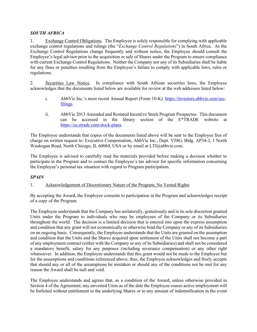 SOUTH AFRICA 1. Exchange Control Obligations. The Employee is solely responsible for complying with applicable exchange control regulations and rulings (the “Exchange Control Regulations”) in South Africa. As the Exchange Control Regulations change frequently and without notice, the Employee should consult the Employee’s legal advisor prior to the acquisition or sale of Shares under the Program to ensure compliance with current Exchange Control Regulations. Neither the Company nor any of its Subsidiaries shall be liable for any fines or penalties resulting from the Employee’s failure to comply with applicable laws, rules or regulations. 2. Securities Law Notice. In compliance with South African securities laws, the Employee acknowledges that the documents listed below are available for review at the web addresses listed below: i. AbbVie Inc.’s most recent Annual Report (Form 10-K): https://investors.abbvie.com/sec- filings. ii. AbbVie 2013 Amended and Restated Incentive Stock Program Prospectus: This document can be accessed in the library section of the E*TRADE website at https://us.etrade.com/stock-plans. The Employee understands that copies of the documents listed above will be sent to the Employee free of charge on written request to: Executive Compensation, AbbVie Inc., Dept. V58G, Bldg. AP34-2, 1 North Waukegan Road, North Chicago, IL 60064, USA or by email at LTI@abbvie.com. The Employee is advised to carefully read the materials provided before making a decision whether to participate in the Program and to contact the Employee’s tax advisor for specific information concerning the Employee’s personal tax situation with regard to Program participation. SPAIN 1. Acknowledgement of Discretionary Nature of the Program; No Vested Rights By accepting the Award, the Employee consents to participation in the Program and acknowledges receipt of a copy of the Program. The Employee understands that the Company has unilaterally, gratuitously and in its sole discretion granted Units under the Program to individuals who may be employees of the Company or its Subsidiaries throughout the world. The decision is a limited decision that is entered into upon the express assumption and condition that any grant will not economically or otherwise bind the Company or any of its Subsidiaries on an ongoing basis. Consequently, the Employee understands that the Units are granted on the assumption and condition that the Units and the Shares acquired upon settlement of the Units shall not become a part of any employment contract (either with the Company or any of its Subsidiaries) and shall not be considered a mandatory benefit, salary for any purposes (including severance compensation) or any other right whatsoever. In addition, the Employee understands that this grant would not be made to the Employee but for the assumptions and conditions referenced above; thus, the Employee acknowledges and freely accepts that should any or all of the assumptions be mistaken or should any of the conditions not be met for any reason the Award shall be null and void. The Employee understands and agrees that, as a condition of the Award, unless otherwise provided in Section 4 of the Agreement, any unvested Units as of the date the Employee ceases active employment will be forfeited without entitlement to the underlying Shares or to any amount of indemnification in the event