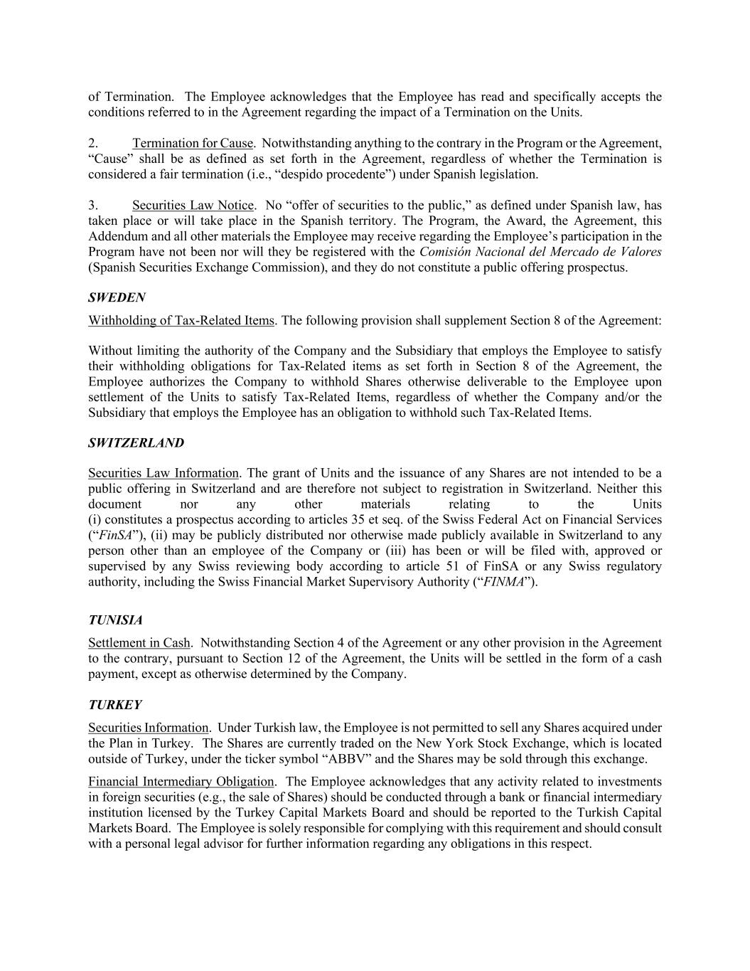 of Termination. The Employee acknowledges that the Employee has read and specifically accepts the conditions referred to in the Agreement regarding the impact of a Termination on the Units. 2. Termination for Cause. Notwithstanding anything to the contrary in the Program or the Agreement, “Cause” shall be as defined as set forth in the Agreement, regardless of whether the Termination is considered a fair termination (i.e., “despido procedente”) under Spanish legislation. 3. Securities Law Notice. No “offer of securities to the public,” as defined under Spanish law, has taken place or will take place in the Spanish territory. The Program, the Award, the Agreement, this Addendum and all other materials the Employee may receive regarding the Employee’s participation in the Program have not been nor will they be registered with the Comisión Nacional del Mercado de Valores (Spanish Securities Exchange Commission), and they do not constitute a public offering prospectus. SWEDEN Withholding of Tax-Related Items. The following provision shall supplement Section 8 of the Agreement: Without limiting the authority of the Company and the Subsidiary that employs the Employee to satisfy their withholding obligations for Tax-Related items as set forth in Section 8 of the Agreement, the Employee authorizes the Company to withhold Shares otherwise deliverable to the Employee upon settlement of the Units to satisfy Tax-Related Items, regardless of whether the Company and/or the Subsidiary that employs the Employee has an obligation to withhold such Tax-Related Items. SWITZERLAND Securities Law Information. The grant of Units and the issuance of any Shares are not intended to be a public offering in Switzerland and are therefore not subject to registration in Switzerland. Neither this document nor any other materials relating to the Units (i) constitutes a prospectus according to articles 35 et seq. of the Swiss Federal Act on Financial Services (“FinSA”), (ii) may be publicly distributed nor otherwise made publicly available in Switzerland to any person other than an employee of the Company or (iii) has been or will be filed with, approved or supervised by any Swiss reviewing body according to article 51 of FinSA or any Swiss regulatory authority, including the Swiss Financial Market Supervisory Authority (“FINMA”). TUNISIA Settlement in Cash. Notwithstanding Section 4 of the Agreement or any other provision in the Agreement to the contrary, pursuant to Section 12 of the Agreement, the Units will be settled in the form of a cash payment, except as otherwise determined by the Company. TURKEY Securities Information. Under Turkish law, the Employee is not permitted to sell any Shares acquired under the Plan in Turkey. The Shares are currently traded on the New York Stock Exchange, which is located outside of Turkey, under the ticker symbol “ABBV” and the Shares may be sold through this exchange. Financial Intermediary Obligation. The Employee acknowledges that any activity related to investments in foreign securities (e.g., the sale of Shares) should be conducted through a bank or financial intermediary institution licensed by the Turkey Capital Markets Board and should be reported to the Turkish Capital Markets Board. The Employee is solely responsible for complying with this requirement and should consult with a personal legal advisor for further information regarding any obligations in this respect.