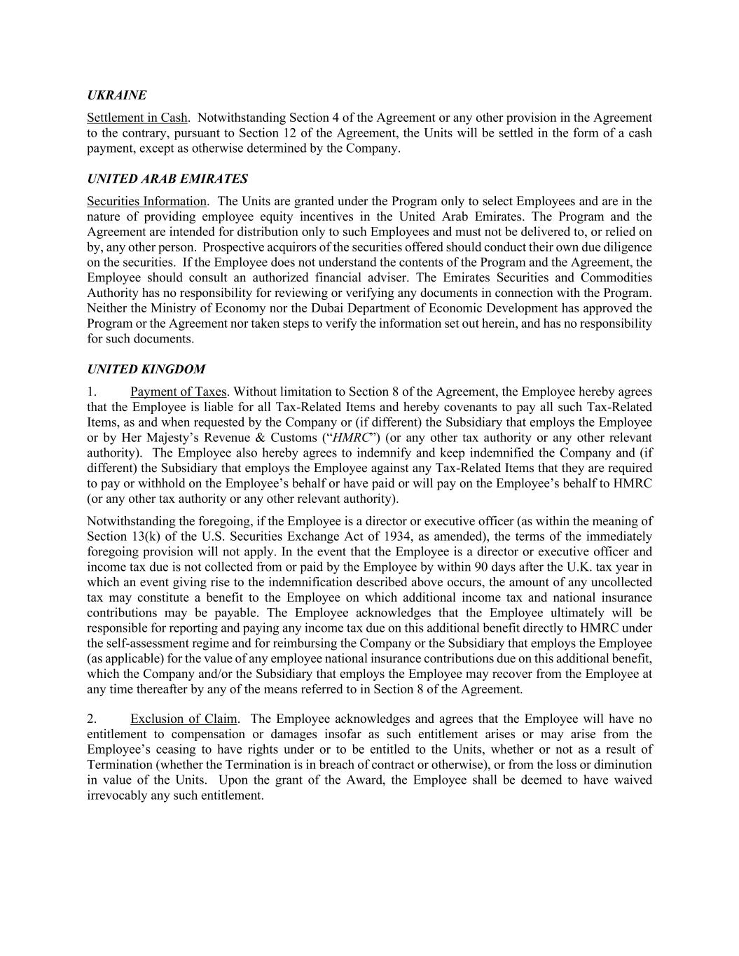 UKRAINE Settlement in Cash. Notwithstanding Section 4 of the Agreement or any other provision in the Agreement to the contrary, pursuant to Section 12 of the Agreement, the Units will be settled in the form of a cash payment, except as otherwise determined by the Company. UNITED ARAB EMIRATES Securities Information. The Units are granted under the Program only to select Employees and are in the nature of providing employee equity incentives in the United Arab Emirates. The Program and the Agreement are intended for distribution only to such Employees and must not be delivered to, or relied on by, any other person. Prospective acquirors of the securities offered should conduct their own due diligence on the securities. If the Employee does not understand the contents of the Program and the Agreement, the Employee should consult an authorized financial adviser. The Emirates Securities and Commodities Authority has no responsibility for reviewing or verifying any documents in connection with the Program. Neither the Ministry of Economy nor the Dubai Department of Economic Development has approved the Program or the Agreement nor taken steps to verify the information set out herein, and has no responsibility for such documents. UNITED KINGDOM 1. Payment of Taxes. Without limitation to Section 8 of the Agreement, the Employee hereby agrees that the Employee is liable for all Tax-Related Items and hereby covenants to pay all such Tax-Related Items, as and when requested by the Company or (if different) the Subsidiary that employs the Employee or by Her Majesty’s Revenue & Customs (“HMRC”) (or any other tax authority or any other relevant authority). The Employee also hereby agrees to indemnify and keep indemnified the Company and (if different) the Subsidiary that employs the Employee against any Tax-Related Items that they are required to pay or withhold on the Employee’s behalf or have paid or will pay on the Employee’s behalf to HMRC (or any other tax authority or any other relevant authority). Notwithstanding the foregoing, if the Employee is a director or executive officer (as within the meaning of Section 13(k) of the U.S. Securities Exchange Act of 1934, as amended), the terms of the immediately foregoing provision will not apply. In the event that the Employee is a director or executive officer and income tax due is not collected from or paid by the Employee by within 90 days after the U.K. tax year in which an event giving rise to the indemnification described above occurs, the amount of any uncollected tax may constitute a benefit to the Employee on which additional income tax and national insurance contributions may be payable. The Employee acknowledges that the Employee ultimately will be responsible for reporting and paying any income tax due on this additional benefit directly to HMRC under the self-assessment regime and for reimbursing the Company or the Subsidiary that employs the Employee (as applicable) for the value of any employee national insurance contributions due on this additional benefit, which the Company and/or the Subsidiary that employs the Employee may recover from the Employee at any time thereafter by any of the means referred to in Section 8 of the Agreement. 2. Exclusion of Claim. The Employee acknowledges and agrees that the Employee will have no entitlement to compensation or damages insofar as such entitlement arises or may arise from the Employee’s ceasing to have rights under or to be entitled to the Units, whether or not as a result of Termination (whether the Termination is in breach of contract or otherwise), or from the loss or diminution in value of the Units. Upon the grant of the Award, the Employee shall be deemed to have waived irrevocably any such entitlement.