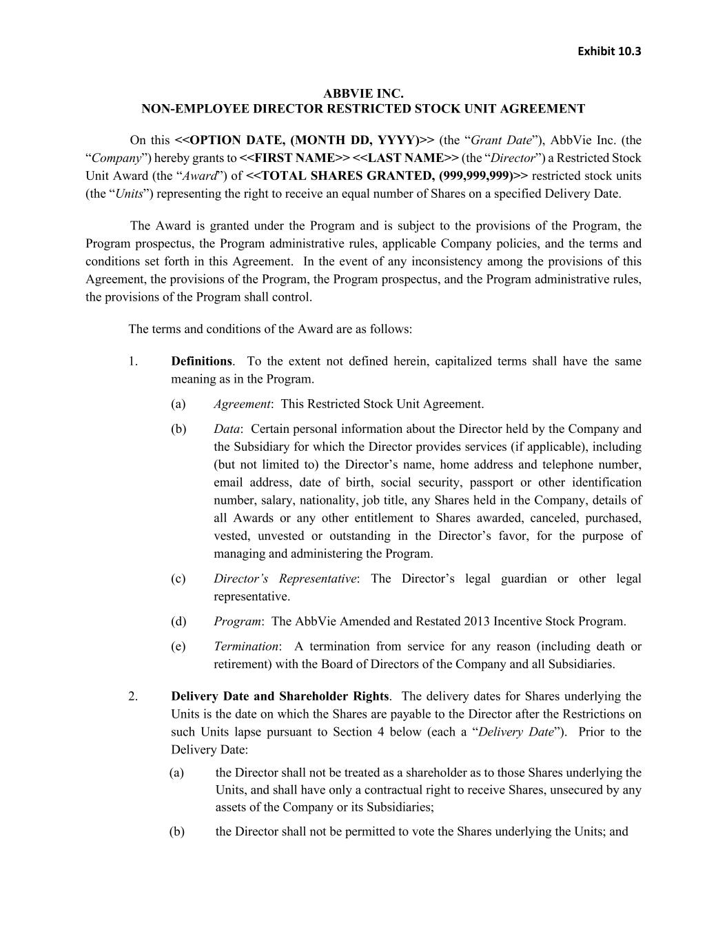Exhibit 10.3 ABBVIE INC. NON-EMPLOYEE DIRECTOR RESTRICTED STOCK UNIT AGREEMENT On this <<OPTION DATE, (MONTH DD, YYYY)>> (the “Grant Date”), AbbVie Inc. (the “Company”) hereby grants to <<FIRST NAME>> <<LAST NAME>> (the “Director”) a Restricted Stock Unit Award (the “Award”) of <<TOTAL SHARES GRANTED, (999,999,999)>> restricted stock units (the “Units”) representing the right to receive an equal number of Shares on a specified Delivery Date. The Award is granted under the Program and is subject to the provisions of the Program, the Program prospectus, the Program administrative rules, applicable Company policies, and the terms and conditions set forth in this Agreement. In the event of any inconsistency among the provisions of this Agreement, the provisions of the Program, the Program prospectus, and the Program administrative rules, the provisions of the Program shall control. The terms and conditions of the Award are as follows: 1. Definitions. To the extent not defined herein, capitalized terms shall have the same meaning as in the Program. (a) Agreement: This Restricted Stock Unit Agreement. (b) Data: Certain personal information about the Director held by the Company and the Subsidiary for which the Director provides services (if applicable), including (but not limited to) the Director’s name, home address and telephone number, email address, date of birth, social security, passport or other identification number, salary, nationality, job title, any Shares held in the Company, details of all Awards or any other entitlement to Shares awarded, canceled, purchased, vested, unvested or outstanding in the Director’s favor, for the purpose of managing and administering the Program. (c) Director’s Representative: The Director’s legal guardian or other legal representative. (d) Program: The AbbVie Amended and Restated 2013 Incentive Stock Program. (e) Termination: A termination from service for any reason (including death or retirement) with the Board of Directors of the Company and all Subsidiaries. 2. Delivery Date and Shareholder Rights. The delivery dates for Shares underlying the Units is the date on which the Shares are payable to the Director after the Restrictions on such Units lapse pursuant to Section 4 below (each a “Delivery Date”). Prior to the Delivery Date: (a) the Director shall not be treated as a shareholder as to those Shares underlying the Units, and shall have only a contractual right to receive Shares, unsecured by any assets of the Company or its Subsidiaries; (b) the Director shall not be permitted to vote the Shares underlying the Units; and