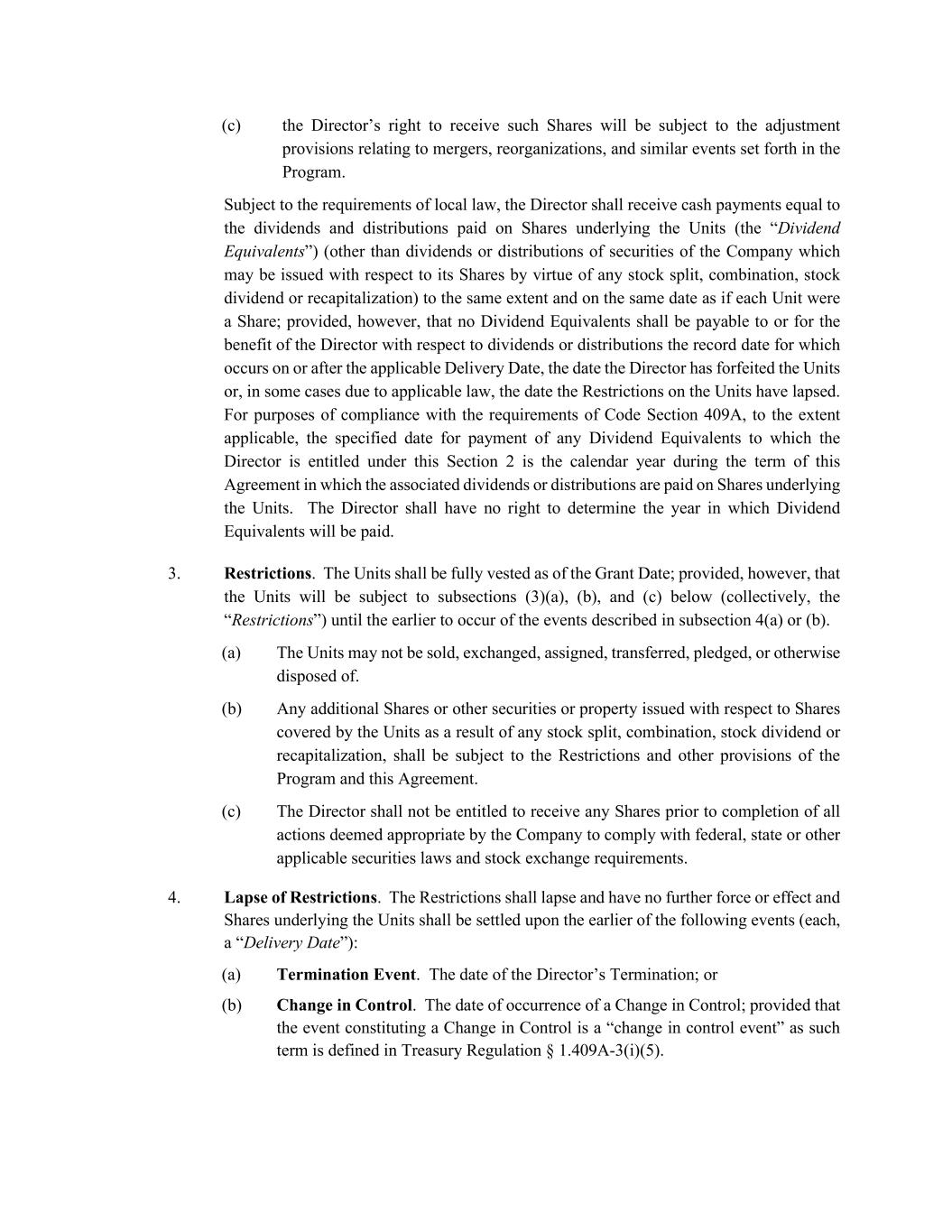 (c) the Director’s right to receive such Shares will be subject to the adjustment provisions relating to mergers, reorganizations, and similar events set forth in the Program. Subject to the requirements of local law, the Director shall receive cash payments equal to the dividends and distributions paid on Shares underlying the Units (the “Dividend Equivalents”) (other than dividends or distributions of securities of the Company which may be issued with respect to its Shares by virtue of any stock split, combination, stock dividend or recapitalization) to the same extent and on the same date as if each Unit were a Share; provided, however, that no Dividend Equivalents shall be payable to or for the benefit of the Director with respect to dividends or distributions the record date for which occurs on or after the applicable Delivery Date, the date the Director has forfeited the Units or, in some cases due to applicable law, the date the Restrictions on the Units have lapsed. For purposes of compliance with the requirements of Code Section 409A, to the extent applicable, the specified date for payment of any Dividend Equivalents to which the Director is entitled under this Section 2 is the calendar year during the term of this Agreement in which the associated dividends or distributions are paid on Shares underlying the Units. The Director shall have no right to determine the year in which Dividend Equivalents will be paid. 3. Restrictions. The Units shall be fully vested as of the Grant Date; provided, however, that the Units will be subject to subsections (3)(a), (b), and (c) below (collectively, the “Restrictions”) until the earlier to occur of the events described in subsection 4(a) or (b). (a) The Units may not be sold, exchanged, assigned, transferred, pledged, or otherwise disposed of. (b) Any additional Shares or other securities or property issued with respect to Shares covered by the Units as a result of any stock split, combination, stock dividend or recapitalization, shall be subject to the Restrictions and other provisions of the Program and this Agreement. (c) The Director shall not be entitled to receive any Shares prior to completion of all actions deemed appropriate by the Company to comply with federal, state or other applicable securities laws and stock exchange requirements. 4. Lapse of Restrictions. The Restrictions shall lapse and have no further force or effect and Shares underlying the Units shall be settled upon the earlier of the following events (each, a “Delivery Date”): (a) Termination Event. The date of the Director’s Termination; or (b) Change in Control. The date of occurrence of a Change in Control; provided that the event constituting a Change in Control is a “change in control event” as such term is defined in Treasury Regulation § 1.409A-3(i)(5).