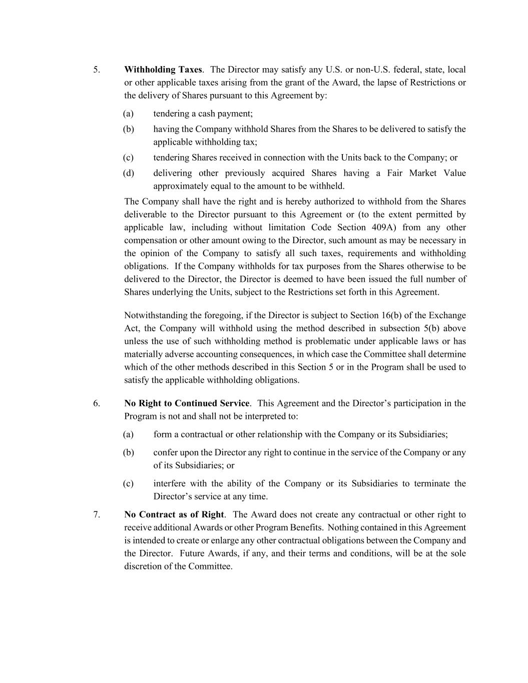 5. Withholding Taxes. The Director may satisfy any U.S. or non-U.S. federal, state, local or other applicable taxes arising from the grant of the Award, the lapse of Restrictions or the delivery of Shares pursuant to this Agreement by: (a) tendering a cash payment; (b) having the Company withhold Shares from the Shares to be delivered to satisfy the applicable withholding tax; (c) tendering Shares received in connection with the Units back to the Company; or (d) delivering other previously acquired Shares having a Fair Market Value approximately equal to the amount to be withheld. The Company shall have the right and is hereby authorized to withhold from the Shares deliverable to the Director pursuant to this Agreement or (to the extent permitted by applicable law, including without limitation Code Section 409A) from any other compensation or other amount owing to the Director, such amount as may be necessary in the opinion of the Company to satisfy all such taxes, requirements and withholding obligations. If the Company withholds for tax purposes from the Shares otherwise to be delivered to the Director, the Director is deemed to have been issued the full number of Shares underlying the Units, subject to the Restrictions set forth in this Agreement. Notwithstanding the foregoing, if the Director is subject to Section 16(b) of the Exchange Act, the Company will withhold using the method described in subsection 5(b) above unless the use of such withholding method is problematic under applicable laws or has materially adverse accounting consequences, in which case the Committee shall determine which of the other methods described in this Section 5 or in the Program shall be used to satisfy the applicable withholding obligations. 6. No Right to Continued Service. This Agreement and the Director’s participation in the Program is not and shall not be interpreted to: (a) form a contractual or other relationship with the Company or its Subsidiaries; (b) confer upon the Director any right to continue in the service of the Company or any of its Subsidiaries; or (c) interfere with the ability of the Company or its Subsidiaries to terminate the Director’s service at any time. 7. No Contract as of Right. The Award does not create any contractual or other right to receive additional Awards or other Program Benefits. Nothing contained in this Agreement is intended to create or enlarge any other contractual obligations between the Company and the Director. Future Awards, if any, and their terms and conditions, will be at the sole discretion of the Committee.