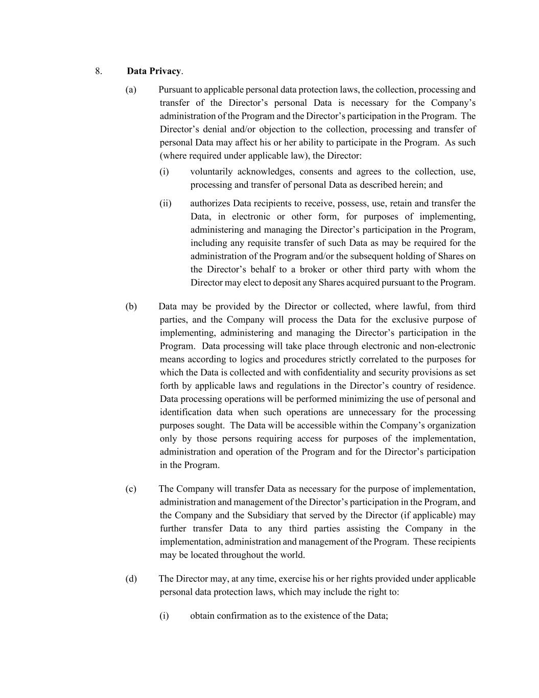 8. Data Privacy. (a) Pursuant to applicable personal data protection laws, the collection, processing and transfer of the Director’s personal Data is necessary for the Company’s administration of the Program and the Director’s participation in the Program. The Director’s denial and/or objection to the collection, processing and transfer of personal Data may affect his or her ability to participate in the Program. As such (where required under applicable law), the Director: (i) voluntarily acknowledges, consents and agrees to the collection, use, processing and transfer of personal Data as described herein; and (ii) authorizes Data recipients to receive, possess, use, retain and transfer the Data, in electronic or other form, for purposes of implementing, administering and managing the Director’s participation in the Program, including any requisite transfer of such Data as may be required for the administration of the Program and/or the subsequent holding of Shares on the Director’s behalf to a broker or other third party with whom the Director may elect to deposit any Shares acquired pursuant to the Program. (b) Data may be provided by the Director or collected, where lawful, from third parties, and the Company will process the Data for the exclusive purpose of implementing, administering and managing the Director’s participation in the Program. Data processing will take place through electronic and non-electronic means according to logics and procedures strictly correlated to the purposes for which the Data is collected and with confidentiality and security provisions as set forth by applicable laws and regulations in the Director’s country of residence. Data processing operations will be performed minimizing the use of personal and identification data when such operations are unnecessary for the processing purposes sought. The Data will be accessible within the Company’s organization only by those persons requiring access for purposes of the implementation, administration and operation of the Program and for the Director’s participation in the Program. (c) The Company will transfer Data as necessary for the purpose of implementation, administration and management of the Director’s participation in the Program, and the Company and the Subsidiary that served by the Director (if applicable) may further transfer Data to any third parties assisting the Company in the implementation, administration and management of the Program. These recipients may be located throughout the world. (d) The Director may, at any time, exercise his or her rights provided under applicable personal data protection laws, which may include the right to: (i) obtain confirmation as to the existence of the Data;