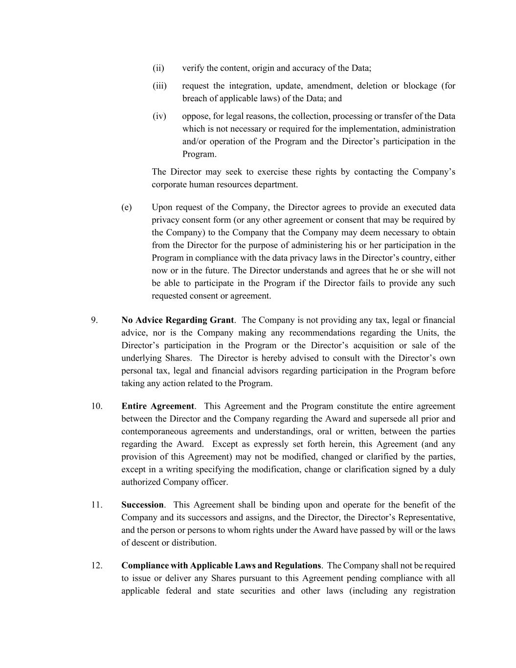 (ii) verify the content, origin and accuracy of the Data; (iii) request the integration, update, amendment, deletion or blockage (for breach of applicable laws) of the Data; and (iv) oppose, for legal reasons, the collection, processing or transfer of the Data which is not necessary or required for the implementation, administration and/or operation of the Program and the Director’s participation in the Program. The Director may seek to exercise these rights by contacting the Company’s corporate human resources department. (e) Upon request of the Company, the Director agrees to provide an executed data privacy consent form (or any other agreement or consent that may be required by the Company) to the Company that the Company may deem necessary to obtain from the Director for the purpose of administering his or her participation in the Program in compliance with the data privacy laws in the Director’s country, either now or in the future. The Director understands and agrees that he or she will not be able to participate in the Program if the Director fails to provide any such requested consent or agreement. 9. No Advice Regarding Grant. The Company is not providing any tax, legal or financial advice, nor is the Company making any recommendations regarding the Units, the Director’s participation in the Program or the Director’s acquisition or sale of the underlying Shares. The Director is hereby advised to consult with the Director’s own personal tax, legal and financial advisors regarding participation in the Program before taking any action related to the Program. 10. Entire Agreement. This Agreement and the Program constitute the entire agreement between the Director and the Company regarding the Award and supersede all prior and contemporaneous agreements and understandings, oral or written, between the parties regarding the Award. Except as expressly set forth herein, this Agreement (and any provision of this Agreement) may not be modified, changed or clarified by the parties, except in a writing specifying the modification, change or clarification signed by a duly authorized Company officer. 11. Succession. This Agreement shall be binding upon and operate for the benefit of the Company and its successors and assigns, and the Director, the Director’s Representative, and the person or persons to whom rights under the Award have passed by will or the laws of descent or distribution. 12. Compliance with Applicable Laws and Regulations. The Company shall not be required to issue or deliver any Shares pursuant to this Agreement pending compliance with all applicable federal and state securities and other laws (including any registration