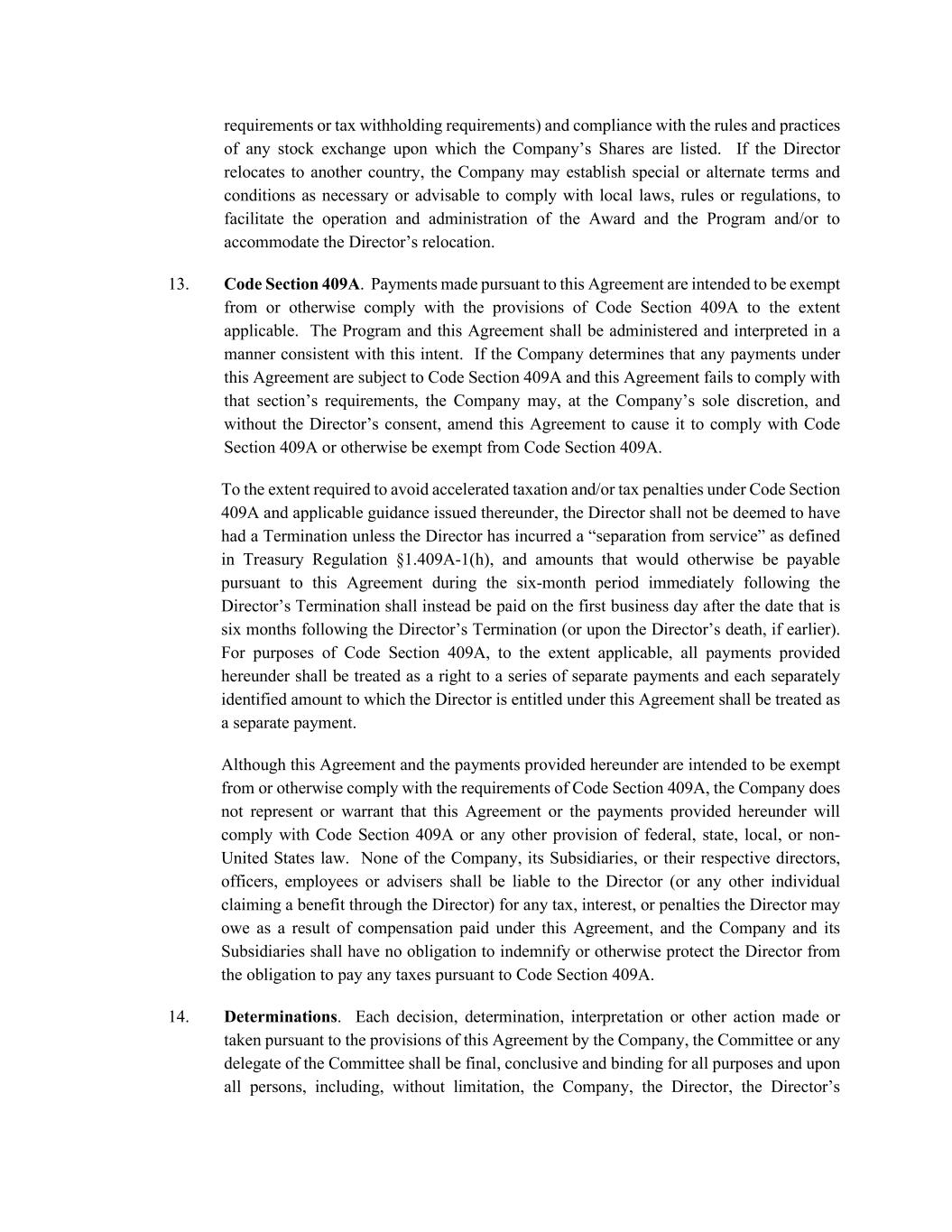 requirements or tax withholding requirements) and compliance with the rules and practices of any stock exchange upon which the Company’s Shares are listed. If the Director relocates to another country, the Company may establish special or alternate terms and conditions as necessary or advisable to comply with local laws, rules or regulations, to facilitate the operation and administration of the Award and the Program and/or to accommodate the Director’s relocation. 13. Code Section 409A. Payments made pursuant to this Agreement are intended to be exempt from or otherwise comply with the provisions of Code Section 409A to the extent applicable. The Program and this Agreement shall be administered and interpreted in a manner consistent with this intent. If the Company determines that any payments under this Agreement are subject to Code Section 409A and this Agreement fails to comply with that section’s requirements, the Company may, at the Company’s sole discretion, and without the Director’s consent, amend this Agreement to cause it to comply with Code Section 409A or otherwise be exempt from Code Section 409A. To the extent required to avoid accelerated taxation and/or tax penalties under Code Section 409A and applicable guidance issued thereunder, the Director shall not be deemed to have had a Termination unless the Director has incurred a “separation from service” as defined in Treasury Regulation §1.409A-1(h), and amounts that would otherwise be payable pursuant to this Agreement during the six-month period immediately following the Director’s Termination shall instead be paid on the first business day after the date that is six months following the Director’s Termination (or upon the Director’s death, if earlier). For purposes of Code Section 409A, to the extent applicable, all payments provided hereunder shall be treated as a right to a series of separate payments and each separately identified amount to which the Director is entitled under this Agreement shall be treated as a separate payment. Although this Agreement and the payments provided hereunder are intended to be exempt from or otherwise comply with the requirements of Code Section 409A, the Company does not represent or warrant that this Agreement or the payments provided hereunder will comply with Code Section 409A or any other provision of federal, state, local, or non- United States law. None of the Company, its Subsidiaries, or their respective directors, officers, employees or advisers shall be liable to the Director (or any other individual claiming a benefit through the Director) for any tax, interest, or penalties the Director may owe as a result of compensation paid under this Agreement, and the Company and its Subsidiaries shall have no obligation to indemnify or otherwise protect the Director from the obligation to pay any taxes pursuant to Code Section 409A. 14. Determinations. Each decision, determination, interpretation or other action made or taken pursuant to the provisions of this Agreement by the Company, the Committee or any delegate of the Committee shall be final, conclusive and binding for all purposes and upon all persons, including, without limitation, the Company, the Director, the Director’s