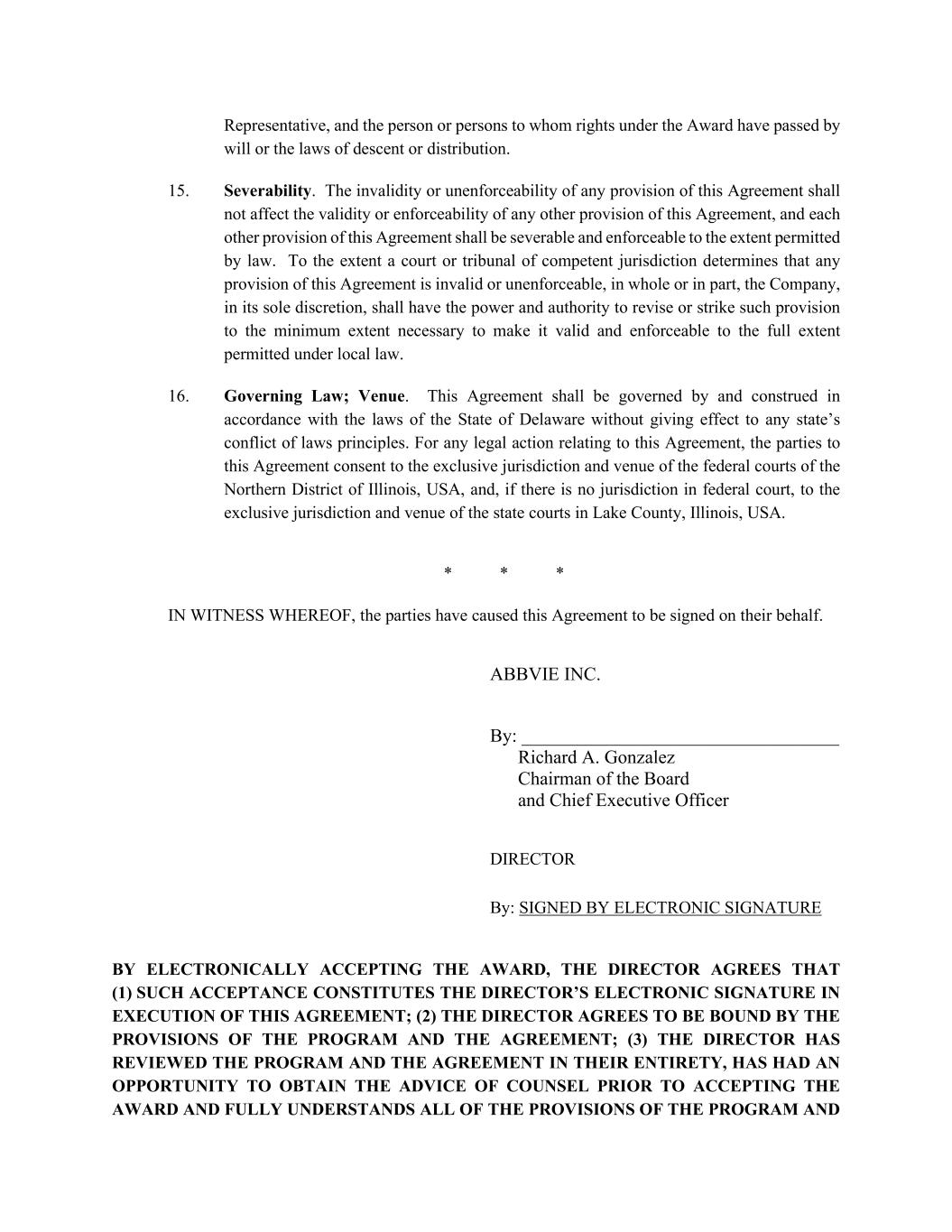 Representative, and the person or persons to whom rights under the Award have passed by will or the laws of descent or distribution. 15. Severability. The invalidity or unenforceability of any provision of this Agreement shall not affect the validity or enforceability of any other provision of this Agreement, and each other provision of this Agreement shall be severable and enforceable to the extent permitted by law. To the extent a court or tribunal of competent jurisdiction determines that any provision of this Agreement is invalid or unenforceable, in whole or in part, the Company, in its sole discretion, shall have the power and authority to revise or strike such provision to the minimum extent necessary to make it valid and enforceable to the full extent permitted under local law. 16. Governing Law; Venue. This Agreement shall be governed by and construed in accordance with the laws of the State of Delaware without giving effect to any state’s conflict of laws principles. For any legal action relating to this Agreement, the parties to this Agreement consent to the exclusive jurisdiction and venue of the federal courts of the Northern District of Illinois, USA, and, if there is no jurisdiction in federal court, to the exclusive jurisdiction and venue of the state courts in Lake County, Illinois, USA. * * * IN WITNESS WHEREOF, the parties have caused this Agreement to be signed on their behalf. ABBVIE INC. By: __________________________________ Richard A. Gonzalez Chairman of the Board and Chief Executive Officer DIRECTOR By: SIGNED BY ELECTRONIC SIGNATURE BY ELECTRONICALLY ACCEPTING THE AWARD, THE DIRECTOR AGREES THAT (1) SUCH ACCEPTANCE CONSTITUTES THE DIRECTOR’S ELECTRONIC SIGNATURE IN EXECUTION OF THIS AGREEMENT; (2) THE DIRECTOR AGREES TO BE BOUND BY THE PROVISIONS OF THE PROGRAM AND THE AGREEMENT; (3) THE DIRECTOR HAS REVIEWED THE PROGRAM AND THE AGREEMENT IN THEIR ENTIRETY, HAS HAD AN OPPORTUNITY TO OBTAIN THE ADVICE OF COUNSEL PRIOR TO ACCEPTING THE AWARD AND FULLY UNDERSTANDS ALL OF THE PROVISIONS OF THE PROGRAM AND