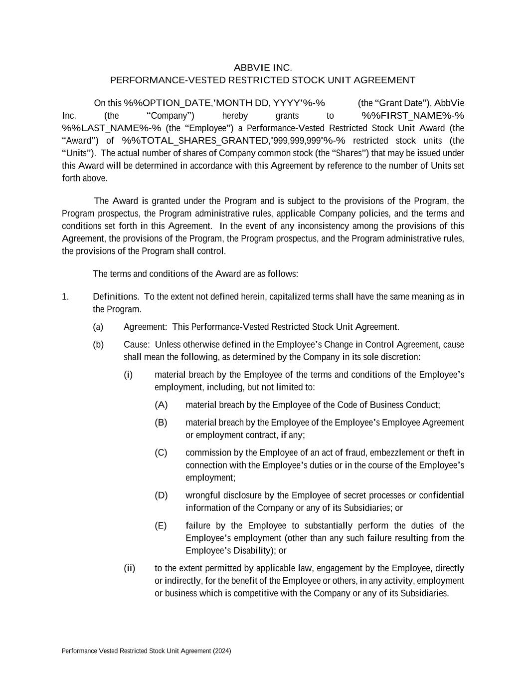 Performance Vested Restricted Stock Unit Agreement (2024) ABBVIE INC. PERFORMANCE-VESTED RESTRICTED STOCK UNIT AGREEMENT On this %%OPTION_DATE,'MONTH DD, YYYY'%-% (the “Grant Date”), AbbVie Inc. (the “Company”) hereby grants to %%FIRST_NAME%-% %%LAST_NAME%-% (the “Employee”) a Performance-Vested Restricted Stock Unit Award (the “Award”) of %%TOTAL_SHARES_GRANTED,'999,999,999'%-% restricted stock units (the “Units”). The actual number of shares of Company common stock (the “Shares”) that may be issued under this Award will be determined in accordance with this Agreement by reference to the number of Units set forth above. The Award is granted under the Program and is subject to the provisions of the Program, the Program prospectus, the Program administrative rules, applicable Company policies, and the terms and conditions set forth in this Agreement. In the event of any inconsistency among the provisions of this Agreement, the provisions of the Program, the Program prospectus, and the Program administrative rules, the provisions of the Program shall control. The terms and conditions of the Award are as follows: 1. Definitions. To the extent not defined herein, capitalized terms shall have the same meaning as in the Program. (a) Agreement: This Performance-Vested Restricted Stock Unit Agreement. (b) Cause: Unless otherwise defined in the Employee’s Change in Control Agreement, cause shall mean the following, as determined by the Company in its sole discretion: (i) material breach by the Employee of the terms and conditions of the Employee’s employment, including, but not limited to: (A) material breach by the Employee of the Code of Business Conduct; (B) material breach by the Employee of the Employee’s Employee Agreement or employment contract, if any; (C) commission by the Employee of an act of fraud, embezzlement or theft in connection with the Employee’s duties or in the course of the Employee’s employment; (D) wrongful disclosure by the Employee of secret processes or confidential information of the Company or any of its Subsidiaries; or (E) failure by the Employee to substantially perform the duties of the Employee’s employment (other than any such failure resulting from the Employee’s Disability); or (ii) to the extent permitted by applicable law, engagement by the Employee, directly or indirectly, for the benefit of the Employee or others, in any activity, employment or business which is competitive with the Company or any of its Subsidiaries.