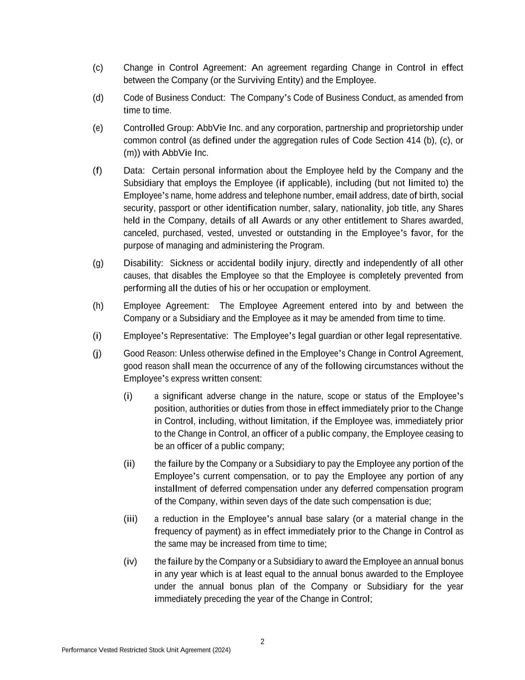 2 Performance Vested Restricted Stock Unit Agreement (2024) (c) Change in Control Agreement: An agreement regarding Change in Control in effect between the Company (or the Surviving Entity) and the Employee. (d) Code of Business Conduct: The Company’s Code of Business Conduct, as amended from time to time. (e) Controlled Group: AbbVie Inc. and any corporation, partnership and proprietorship under common control (as defined under the aggregation rules of Code Section 414 (b), (c), or (m)) with AbbVie Inc. (f) Data: Certain personal information about the Employee held by the Company and the Subsidiary that employs the Employee (if applicable), including (but not limited to) the Employee’s name, home address and telephone number, email address, date of birth, social security, passport or other identification number, salary, nationality, job title, any Shares held in the Company, details of all Awards or any other entitlement to Shares awarded, canceled, purchased, vested, unvested or outstanding in the Employee’s favor, for the purpose of managing and administering the Program. (g) Disability: Sickness or accidental bodily injury, directly and independently of all other causes, that disables the Employee so that the Employee is completely prevented from performing all the duties of his or her occupation or employment. (h) Employee Agreement: The Employee Agreement entered into by and between the Company or a Subsidiary and the Employee as it may be amended from time to time. (i) Employee’s Representative: The Employee’s legal guardian or other legal representative. (j) Good Reason: Unless otherwise defined in the Employee’s Change in Control Agreement, good reason shall mean the occurrence of any of the following circumstances without the Employee’s express written consent: (i) a significant adverse change in the nature, scope or status of the Employee’s position, authorities or duties from those in effect immediately prior to the Change in Control, including, without limitation, if the Employee was, immediately prior to the Change in Control, an officer of a public company, the Employee ceasing to be an officer of a public company; (ii) the failure by the Company or a Subsidiary to pay the Employee any portion of the Employee’s current compensation, or to pay the Employee any portion of any installment of deferred compensation under any deferred compensation program of the Company, within seven days of the date such compensation is due; (iii) a reduction in the Employee’s annual base salary (or a material change in the frequency of payment) as in effect immediately prior to the Change in Control as the same may be increased from time to time; (iv) the failure by the Company or a Subsidiary to award the Employee an annual bonus in any year which is at least equal to the annual bonus awarded to the Employee under the annual bonus plan of the Company or Subsidiary for the year immediately preceding the year of the Change in Control;