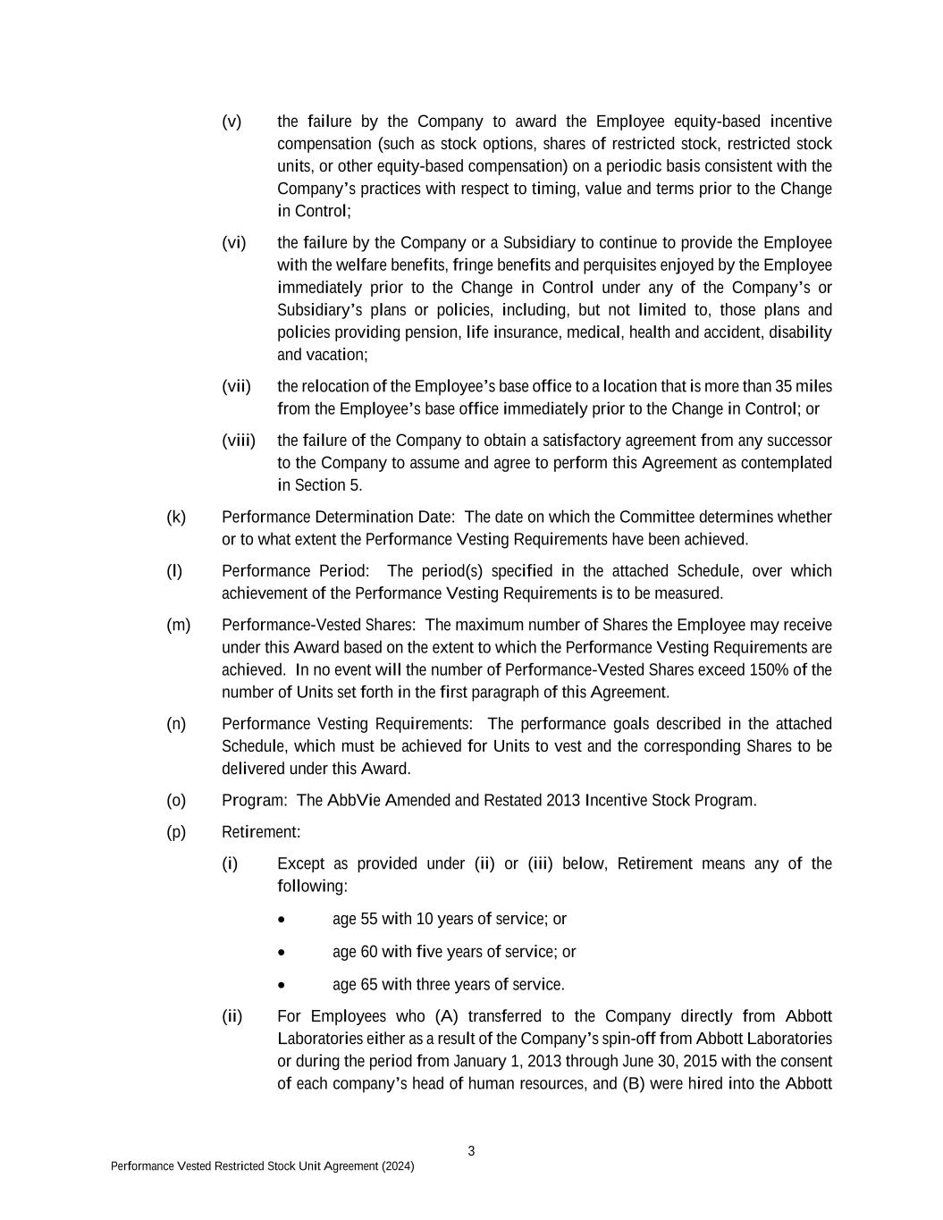 3 Performance Vested Restricted Stock Unit Agreement (2024) (v) the failure by the Company to award the Employee equity-based incentive compensation (such as stock options, shares of restricted stock, restricted stock units, or other equity-based compensation) on a periodic basis consistent with the Company’s practices with respect to timing, value and terms prior to the Change in Control; (vi) the failure by the Company or a Subsidiary to continue to provide the Employee with the welfare benefits, fringe benefits and perquisites enjoyed by the Employee immediately prior to the Change in Control under any of the Company’s or Subsidiary’s plans or policies, including, but not limited to, those plans and policies providing pension, life insurance, medical, health and accident, disability and vacation; (vii) the relocation of the Employee’s base office to a location that is more than 35 miles from the Employee’s base office immediately prior to the Change in Control; or (viii) the failure of the Company to obtain a satisfactory agreement from any successor to the Company to assume and agree to perform this Agreement as contemplated in Section 5. (k) Performance Determination Date: The date on which the Committee determines whether or to what extent the Performance Vesting Requirements have been achieved. (l) Performance Period: The period(s) specified in the attached Schedule, over which achievement of the Performance Vesting Requirements is to be measured. (m) Performance-Vested Shares: The maximum number of Shares the Employee may receive under this Award based on the extent to which the Performance Vesting Requirements are achieved. In no event will the number of Performance-Vested Shares exceed 150% of the number of Units set forth in the first paragraph of this Agreement. (n) Performance Vesting Requirements: The performance goals described in the attached Schedule, which must be achieved for Units to vest and the corresponding Shares to be delivered under this Award. (o) Program: The AbbVie Amended and Restated 2013 Incentive Stock Program. (p) Retirement: (i) Except as provided under (ii) or (iii) below, Retirement means any of the following:  age 55 with 10 years of service; or  age 60 with five years of service; or  age 65 with three years of service. (ii) For Employees who (A) transferred to the Company directly from Abbott Laboratories either as a result of the Company’s spin-off from Abbott Laboratories or during the period from January 1, 2013 through June 30, 2015 with the consent of each company’s head of human resources, and (B) were hired into the Abbott