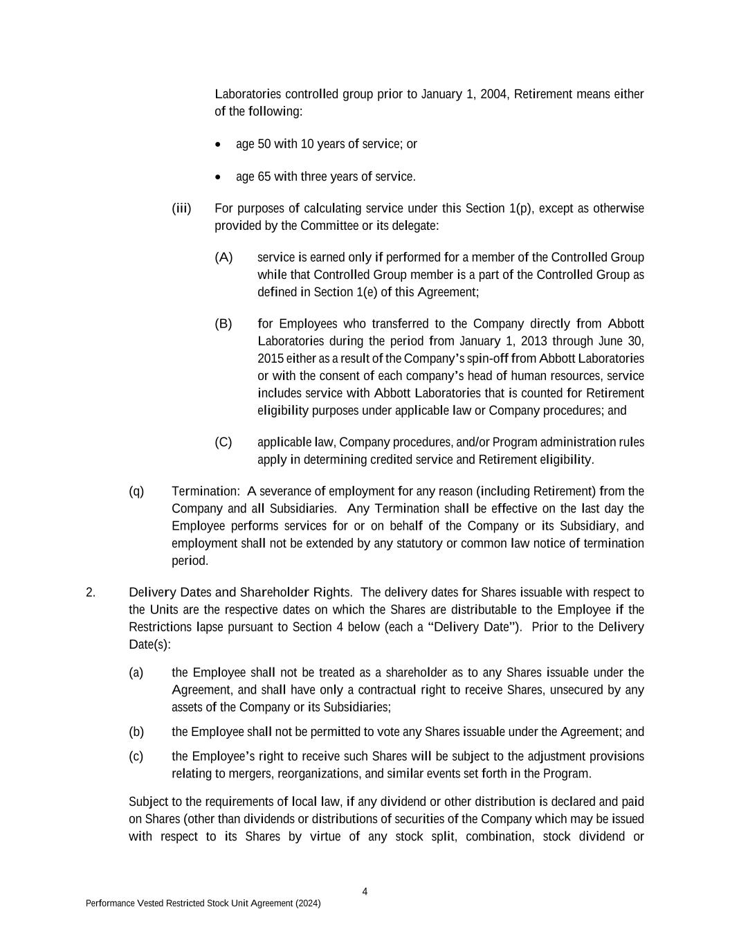4 Performance Vested Restricted Stock Unit Agreement (2024) Laboratories controlled group prior to January 1, 2004, Retirement means either of the following:  age 50 with 10 years of service; or  age 65 with three years of service. (iii) For purposes of calculating service under this Section 1(p), except as otherwise provided by the Committee or its delegate: (A) service is earned only if performed for a member of the Controlled Group while that Controlled Group member is a part of the Controlled Group as defined in Section 1(e) of this Agreement; (B) for Employees who transferred to the Company directly from Abbott Laboratories during the period from January 1, 2013 through June 30, 2015 either as a result of the Company’s spin-off from Abbott Laboratories or with the consent of each company’s head of human resources, service includes service with Abbott Laboratories that is counted for Retirement eligibility purposes under applicable law or Company procedures; and (C) applicable law, Company procedures, and/or Program administration rules apply in determining credited service and Retirement eligibility. (q) Termination: A severance of employment for any reason (including Retirement) from the Company and all Subsidiaries. Any Termination shall be effective on the last day the Employee performs services for or on behalf of the Company or its Subsidiary, and employment shall not be extended by any statutory or common law notice of termination period. 2. Delivery Dates and Shareholder Rights. The delivery dates for Shares issuable with respect to the Units are the respective dates on which the Shares are distributable to the Employee if the Restrictions lapse pursuant to Section 4 below (each a “Delivery Date”). Prior to the Delivery Date(s): (a) the Employee shall not be treated as a shareholder as to any Shares issuable under the Agreement, and shall have only a contractual right to receive Shares, unsecured by any assets of the Company or its Subsidiaries; (b) the Employee shall not be permitted to vote any Shares issuable under the Agreement; and (c) the Employee’s right to receive such Shares will be subject to the adjustment provisions relating to mergers, reorganizations, and similar events set forth in the Program. Subject to the requirements of local law, if any dividend or other distribution is declared and paid on Shares (other than dividends or distributions of securities of the Company which may be issued with respect to its Shares by virtue of any stock split, combination, stock dividend or