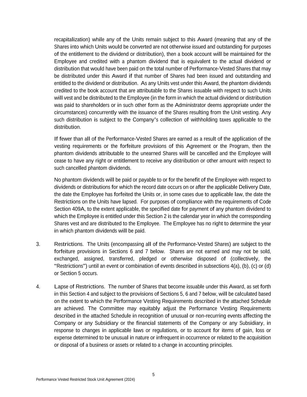 5 Performance Vested Restricted Stock Unit Agreement (2024) recapitalization) while any of the Units remain subject to this Award (meaning that any of the Shares into which Units would be converted are not otherwise issued and outstanding for purposes of the entitlement to the dividend or distribution), then a book account will be maintained for the Employee and credited with a phantom dividend that is equivalent to the actual dividend or distribution that would have been paid on the total number of Performance-Vested Shares that may be distributed under this Award if that number of Shares had been issued and outstanding and entitled to the dividend or distribution. As any Units vest under this Award, the phantom dividends credited to the book account that are attributable to the Shares issuable with respect to such Units will vest and be distributed to the Employee (in the form in which the actual dividend or distribution was paid to shareholders or in such other form as the Administrator deems appropriate under the circumstances) concurrently with the issuance of the Shares resulting from the Unit vesting. Any such distribution is subject to the Company’s collection of withholding taxes applicable to the distribution. If fewer than all of the Performance-Vested Shares are earned as a result of the application of the vesting requirements or the forfeiture provisions of this Agreement or the Program, then the phantom dividends attributable to the unearned Shares will be cancelled and the Employee will cease to have any right or entitlement to receive any distribution or other amount with respect to such cancelled phantom dividends. No phantom dividends will be paid or payable to or for the benefit of the Employee with respect to dividends or distributions for which the record date occurs on or after the applicable Delivery Date, the date the Employee has forfeited the Units or, in some cases due to applicable law, the date the Restrictions on the Units have lapsed. For purposes of compliance with the requirements of Code Section 409A, to the extent applicable, the specified date for payment of any phantom dividend to which the Employee is entitled under this Section 2 is the calendar year in which the corresponding Shares vest and are distributed to the Employee. The Employee has no right to determine the year in which phantom dividends will be paid. 3. Restrictions. The Units (encompassing all of the Performance-Vested Shares) are subject to the forfeiture provisions in Sections 6 and 7 below. Shares are not earned and may not be sold, exchanged, assigned, transferred, pledged or otherwise disposed of (collectively, the “Restrictions”) until an event or combination of events described in subsections 4(a), (b), (c) or (d) or Section 5 occurs. 4. Lapse of Restrictions. The number of Shares that become issuable under this Award, as set forth in this Section 4 and subject to the provisions of Sections 5, 6 and 7 below, will be calculated based on the extent to which the Performance Vesting Requirements described in the attached Schedule are achieved. The Committee may equitably adjust the Performance Vesting Requirements described in the attached Schedule in recognition of unusual or non-recurring events affecting the Company or any Subsidiary or the financial statements of the Company or any Subsidiary, in response to changes in applicable laws or regulations, or to account for items of gain, loss or expense determined to be unusual in nature or infrequent in occurrence or related to the acquisition or disposal of a business or assets or related to a change in accounting principles.