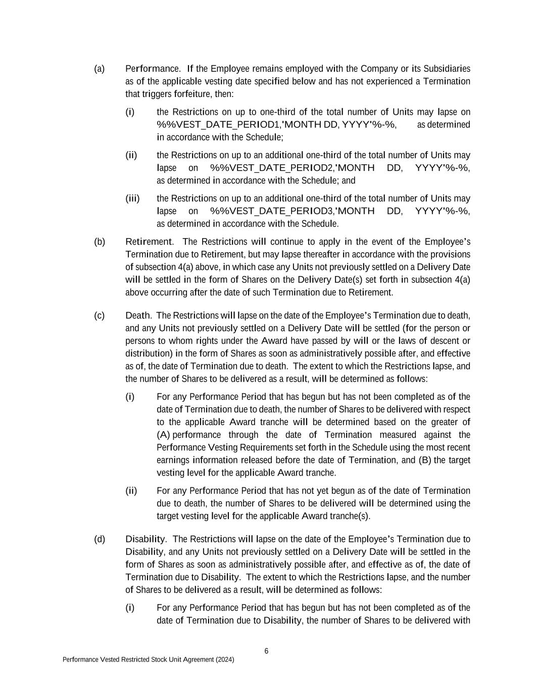 6 Performance Vested Restricted Stock Unit Agreement (2024) (a) Performance. If the Employee remains employed with the Company or its Subsidiaries as of the applicable vesting date specified below and has not experienced a Termination that triggers forfeiture, then: (i) the Restrictions on up to one-third of the total number of Units may lapse on %%VEST_DATE_PERIOD1,'MONTH DD, YYYY'%-%, as determined in accordance with the Schedule; (ii) the Restrictions on up to an additional one-third of the total number of Units may lapse on %%VEST_DATE_PERIOD2,'MONTH DD, YYYY'%-%, as determined in accordance with the Schedule; and (iii) the Restrictions on up to an additional one-third of the total number of Units may lapse on %%VEST_DATE_PERIOD3,'MONTH DD, YYYY'%-%, as determined in accordance with the Schedule. (b) Retirement. The Restrictions will continue to apply in the event of the Employee’s Termination due to Retirement, but may lapse thereafter in accordance with the provisions of subsection 4(a) above, in which case any Units not previously settled on a Delivery Date will be settled in the form of Shares on the Delivery Date(s) set forth in subsection 4(a) above occurring after the date of such Termination due to Retirement. (c) Death. The Restrictions will lapse on the date of the Employee’s Termination due to death, and any Units not previously settled on a Delivery Date will be settled (for the person or persons to whom rights under the Award have passed by will or the laws of descent or distribution) in the form of Shares as soon as administratively possible after, and effective as of, the date of Termination due to death. The extent to which the Restrictions lapse, and the number of Shares to be delivered as a result, will be determined as follows: (i) For any Performance Period that has begun but has not been completed as of the date of Termination due to death, the number of Shares to be delivered with respect to the applicable Award tranche will be determined based on the greater of (A) performance through the date of Termination measured against the Performance Vesting Requirements set forth in the Schedule using the most recent earnings information released before the date of Termination, and (B) the target vesting level for the applicable Award tranche. (ii) For any Performance Period that has not yet begun as of the date of Termination due to death, the number of Shares to be delivered will be determined using the target vesting level for the applicable Award tranche(s). (d) Disability. The Restrictions will lapse on the date of the Employee’s Termination due to Disability, and any Units not previously settled on a Delivery Date will be settled in the form of Shares as soon as administratively possible after, and effective as of, the date of Termination due to Disability. The extent to which the Restrictions lapse, and the number of Shares to be delivered as a result, will be determined as follows: (i) For any Performance Period that has begun but has not been completed as of the date of Termination due to Disability, the number of Shares to be delivered with