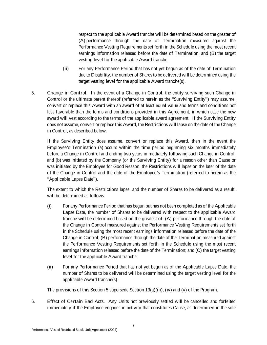 7 Performance Vested Restricted Stock Unit Agreement (2024) respect to the applicable Award tranche will be determined based on the greater of (A) performance through the date of Termination measured against the Performance Vesting Requirements set forth in the Schedule using the most recent earnings information released before the date of Termination, and (B) the target vesting level for the applicable Award tranche. (ii) For any Performance Period that has not yet begun as of the date of Termination due to Disability, the number of Shares to be delivered will be determined using the target vesting level for the applicable Award tranche(s). 5. Change in Control. In the event of a Change in Control, the entity surviving such Change in Control or the ultimate parent thereof (referred to herein as the “Surviving Entity”) may assume, convert or replace this Award with an award of at least equal value and terms and conditions not less favorable than the terms and conditions provided in this Agreement, in which case the new award will vest according to the terms of the applicable award agreement. If the Surviving Entity does not assume, convert or replace this Award, the Restrictions will lapse on the date of the Change in Control, as described below. If the Surviving Entity does assume, convert or replace this Award, then in the event the Employee’s Termination (a) occurs within the time period beginning six months immediately before a Change in Control and ending two years immediately following such Change in Control, and (b) was initiated by the Company (or the Surviving Entity) for a reason other than Cause or was initiated by the Employee for Good Reason, the Restrictions will lapse on the later of the date of the Change in Control and the date of the Employee’s Termination (referred to herein as the “Applicable Lapse Date”). The extent to which the Restrictions lapse, and the number of Shares to be delivered as a result, will be determined as follows: (i) For any Performance Period that has begun but has not been completed as of the Applicable Lapse Date, the number of Shares to be delivered with respect to the applicable Award tranche will be determined based on the greatest of: (A) performance through the date of the Change in Control measured against the Performance Vesting Requirements set forth in the Schedule using the most recent earnings information released before the date of the Change in Control; (B) performance through the date of the Termination measured against the Performance Vesting Requirements set forth in the Schedule using the most recent earnings information released before the date of the Termination; and (C) the target vesting level for the applicable Award tranche. (ii) For any Performance Period that has not yet begun as of the Applicable Lapse Date, the number of Shares to be delivered will be determined using the target vesting level for the applicable Award tranche(s). The provisions of this Section 5 supersede Section 13(a)(iii), (iv) and (v) of the Program. 6. Effect of Certain Bad Acts. Any Units not previously settled will be cancelled and forfeited immediately if the Employee engages in activity that constitutes Cause, as determined in the sole