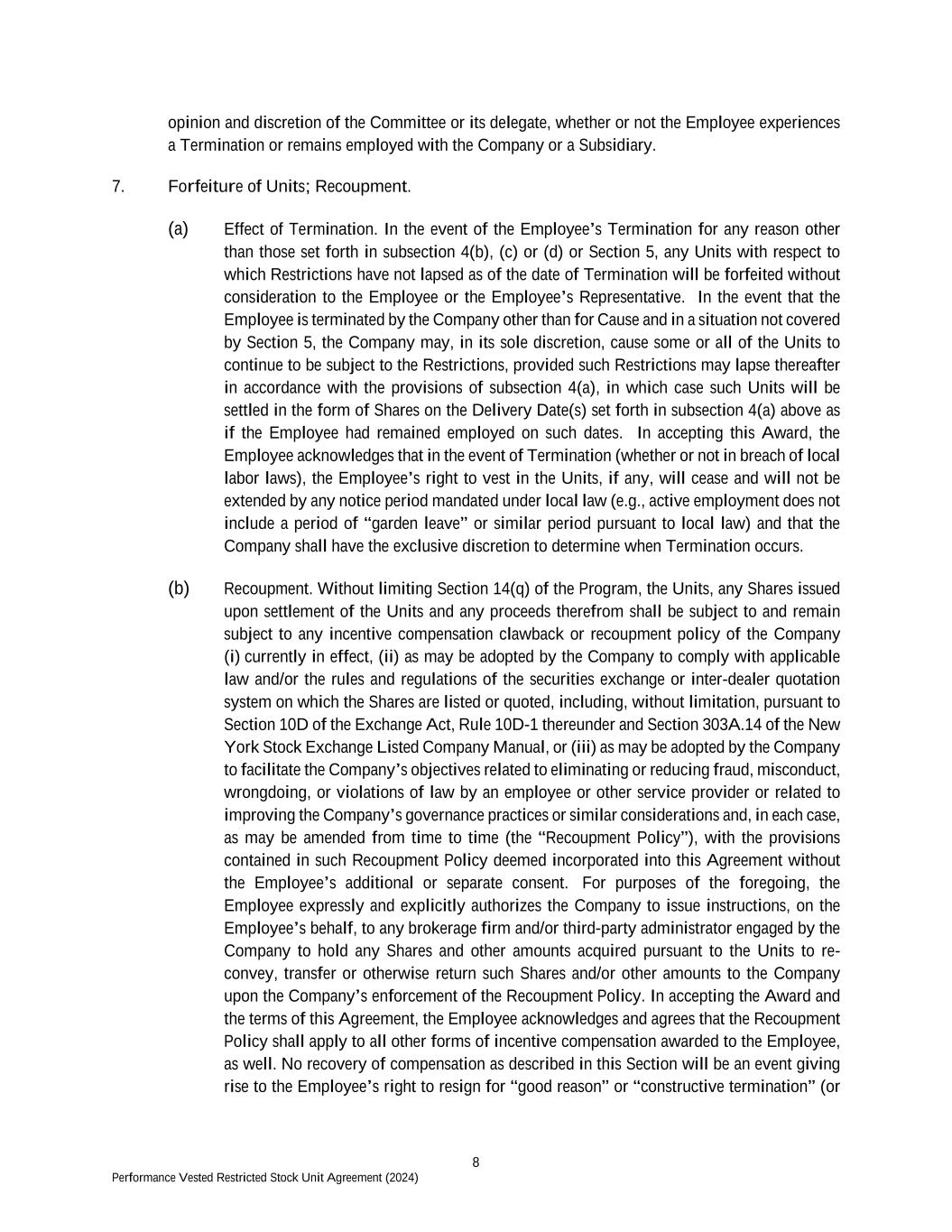 8 Performance Vested Restricted Stock Unit Agreement (2024) opinion and discretion of the Committee or its delegate, whether or not the Employee experiences a Termination or remains employed with the Company or a Subsidiary. 7. Forfeiture of Units; Recoupment. (a) Effect of Termination. In the event of the Employee’s Termination for any reason other than those set forth in subsection 4(b), (c) or (d) or Section 5, any Units with respect to which Restrictions have not lapsed as of the date of Termination will be forfeited without consideration to the Employee or the Employee’s Representative. In the event that the Employee is terminated by the Company other than for Cause and in a situation not covered by Section 5, the Company may, in its sole discretion, cause some or all of the Units to continue to be subject to the Restrictions, provided such Restrictions may lapse thereafter in accordance with the provisions of subsection 4(a), in which case such Units will be settled in the form of Shares on the Delivery Date(s) set forth in subsection 4(a) above as if the Employee had remained employed on such dates. In accepting this Award, the Employee acknowledges that in the event of Termination (whether or not in breach of local labor laws), the Employee’s right to vest in the Units, if any, will cease and will not be extended by any notice period mandated under local law (e.g., active employment does not include a period of “garden leave” or similar period pursuant to local law) and that the Company shall have the exclusive discretion to determine when Termination occurs. (b) Recoupment. Without limiting Section 14(q) of the Program, the Units, any Shares issued upon settlement of the Units and any proceeds therefrom shall be subject to and remain subject to any incentive compensation clawback or recoupment policy of the Company (i) currently in effect, (ii) as may be adopted by the Company to comply with applicable law and/or the rules and regulations of the securities exchange or inter-dealer quotation system on which the Shares are listed or quoted, including, without limitation, pursuant to Section 10D of the Exchange Act, Rule 10D-1 thereunder and Section 303A.14 of the New York Stock Exchange Listed Company Manual, or (iii) as may be adopted by the Company to facilitate the Company’s objectives related to eliminating or reducing fraud, misconduct, wrongdoing, or violations of law by an employee or other service provider or related to improving the Company’s governance practices or similar considerations and, in each case, as may be amended from time to time (the “Recoupment Policy”), with the provisions contained in such Recoupment Policy deemed incorporated into this Agreement without the Employee’s additional or separate consent. For purposes of the foregoing, the Employee expressly and explicitly authorizes the Company to issue instructions, on the Employee’s behalf, to any brokerage firm and/or third-party administrator engaged by the Company to hold any Shares and other amounts acquired pursuant to the Units to re- convey, transfer or otherwise return such Shares and/or other amounts to the Company upon the Company’s enforcement of the Recoupment Policy. In accepting the Award and the terms of this Agreement, the Employee acknowledges and agrees that the Recoupment Policy shall apply to all other forms of incentive compensation awarded to the Employee, as well. No recovery of compensation as described in this Section will be an event giving rise to the Employee’s right to resign for “good reason” or “constructive termination” (or