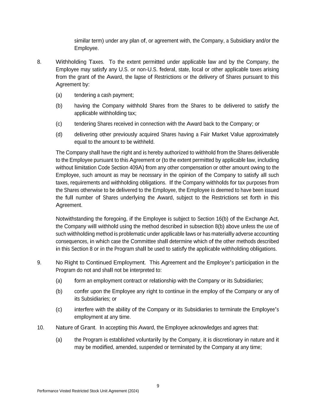 9 Performance Vested Restricted Stock Unit Agreement (2024) similar term) under any plan of, or agreement with, the Company, a Subsidiary and/or the Employee. 8. Withholding Taxes. To the extent permitted under applicable law and by the Company, the Employee may satisfy any U.S. or non-U.S. federal, state, local or other applicable taxes arising from the grant of the Award, the lapse of Restrictions or the delivery of Shares pursuant to this Agreement by: (a) tendering a cash payment; (b) having the Company withhold Shares from the Shares to be delivered to satisfy the applicable withholding tax; (c) tendering Shares received in connection with the Award back to the Company; or (d) delivering other previously acquired Shares having a Fair Market Value approximately equal to the amount to be withheld. The Company shall have the right and is hereby authorized to withhold from the Shares deliverable to the Employee pursuant to this Agreement or (to the extent permitted by applicable law, including without limitation Code Section 409A) from any other compensation or other amount owing to the Employee, such amount as may be necessary in the opinion of the Company to satisfy all such taxes, requirements and withholding obligations. If the Company withholds for tax purposes from the Shares otherwise to be delivered to the Employee, the Employee is deemed to have been issued the full number of Shares underlying the Award, subject to the Restrictions set forth in this Agreement. Notwithstanding the foregoing, if the Employee is subject to Section 16(b) of the Exchange Act, the Company will withhold using the method described in subsection 8(b) above unless the use of such withholding method is problematic under applicable laws or has materially adverse accounting consequences, in which case the Committee shall determine which of the other methods described in this Section 8 or in the Program shall be used to satisfy the applicable withholding obligations. 9. No Right to Continued Employment. This Agreement and the Employee’s participation in the Program do not and shall not be interpreted to: (a) form an employment contract or relationship with the Company or its Subsidiaries; (b) confer upon the Employee any right to continue in the employ of the Company or any of its Subsidiaries; or (c) interfere with the ability of the Company or its Subsidiaries to terminate the Employee’s employment at any time. 10. Nature of Grant. In accepting this Award, the Employee acknowledges and agrees that: (a) the Program is established voluntarily by the Company, it is discretionary in nature and it may be modified, amended, suspended or terminated by the Company at any time;