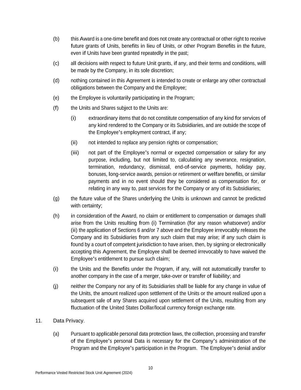 10 Performance Vested Restricted Stock Unit Agreement (2024) (b) this Award is a one-time benefit and does not create any contractual or other right to receive future grants of Units, benefits in lieu of Units, or other Program Benefits in the future, even if Units have been granted repeatedly in the past; (c) all decisions with respect to future Unit grants, if any, and their terms and conditions, will be made by the Company, in its sole discretion; (d) nothing contained in this Agreement is intended to create or enlarge any other contractual obligations between the Company and the Employee; (e) the Employee is voluntarily participating in the Program; (f) the Units and Shares subject to the Units are: (i) extraordinary items that do not constitute compensation of any kind for services of any kind rendered to the Company or its Subsidiaries, and are outside the scope of the Employee’s employment contract, if any; (ii) not intended to replace any pension rights or compensation; (iii) not part of the Employee’s normal or expected compensation or salary for any purpose, including, but not limited to, calculating any severance, resignation, termination, redundancy, dismissal, end-of-service payments, holiday pay, bonuses, long-service awards, pension or retirement or welfare benefits, or similar payments and in no event should they be considered as compensation for, or relating in any way to, past services for the Company or any of its Subsidiaries; (g) the future value of the Shares underlying the Units is unknown and cannot be predicted with certainty; (h) in consideration of the Award, no claim or entitlement to compensation or damages shall arise from the Units resulting from (i) Termination (for any reason whatsoever) and/or (ii) the application of Sections 6 and/or 7 above and the Employee irrevocably releases the Company and its Subsidiaries from any such claim that may arise; if any such claim is found by a court of competent jurisdiction to have arisen, then, by signing or electronically accepting this Agreement, the Employee shall be deemed irrevocably to have waived the Employee’s entitlement to pursue such claim; (i) the Units and the Benefits under the Program, if any, will not automatically transfer to another company in the case of a merger, take-over or transfer of liability; and (j) neither the Company nor any of its Subsidiaries shall be liable for any change in value of the Units, the amount realized upon settlement of the Units or the amount realized upon a subsequent sale of any Shares acquired upon settlement of the Units, resulting from any fluctuation of the United States Dollar/local currency foreign exchange rate. 11. Data Privacy. (a) Pursuant to applicable personal data protection laws, the collection, processing and transfer of the Employee’s personal Data is necessary for the Company’s administration of the Program and the Employee’s participation in the Program. The Employee’s denial and/or