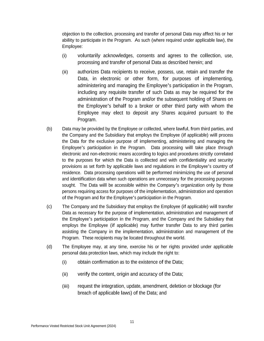 11 Performance Vested Restricted Stock Unit Agreement (2024) objection to the collection, processing and transfer of personal Data may affect his or her ability to participate in the Program. As such (where required under applicable law), the Employee: (i) voluntarily acknowledges, consents and agrees to the collection, use, processing and transfer of personal Data as described herein; and (ii) authorizes Data recipients to receive, possess, use, retain and transfer the Data, in electronic or other form, for purposes of implementing, administering and managing the Employee’s participation in the Program, including any requisite transfer of such Data as may be required for the administration of the Program and/or the subsequent holding of Shares on the Employee’s behalf to a broker or other third party with whom the Employee may elect to deposit any Shares acquired pursuant to the Program. (b) Data may be provided by the Employee or collected, where lawful, from third parties, and the Company and the Subsidiary that employs the Employee (if applicable) will process the Data for the exclusive purpose of implementing, administering and managing the Employee’s participation in the Program. Data processing will take place through electronic and non-electronic means according to logics and procedures strictly correlated to the purposes for which the Data is collected and with confidentiality and security provisions as set forth by applicable laws and regulations in the Employee’s country of residence. Data processing operations will be performed minimizing the use of personal and identification data when such operations are unnecessary for the processing purposes sought. The Data will be accessible within the Company’s organization only by those persons requiring access for purposes of the implementation, administration and operation of the Program and for the Employee’s participation in the Program. (c) The Company and the Subsidiary that employs the Employee (if applicable) will transfer Data as necessary for the purpose of implementation, administration and management of the Employee’s participation in the Program, and the Company and the Subsidiary that employs the Employee (if applicable) may further transfer Data to any third parties assisting the Company in the implementation, administration and management of the Program. These recipients may be located throughout the world. (d) The Employee may, at any time, exercise his or her rights provided under applicable personal data protection laws, which may include the right to: (i) obtain confirmation as to the existence of the Data; (ii) verify the content, origin and accuracy of the Data; (iii) request the integration, update, amendment, deletion or blockage (for breach of applicable laws) of the Data; and