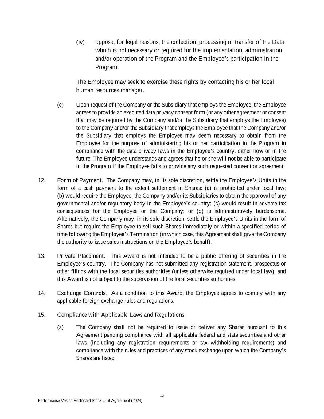 12 Performance Vested Restricted Stock Unit Agreement (2024) (iv) oppose, for legal reasons, the collection, processing or transfer of the Data which is not necessary or required for the implementation, administration and/or operation of the Program and the Employee’s participation in the Program. The Employee may seek to exercise these rights by contacting his or her local human resources manager. (e) Upon request of the Company or the Subsidiary that employs the Employee, the Employee agrees to provide an executed data privacy consent form (or any other agreement or consent that may be required by the Company and/or the Subsidiary that employs the Employee) to the Company and/or the Subsidiary that employs the Employee that the Company and/or the Subsidiary that employs the Employee may deem necessary to obtain from the Employee for the purpose of administering his or her participation in the Program in compliance with the data privacy laws in the Employee’s country, either now or in the future. The Employee understands and agrees that he or she will not be able to participate in the Program if the Employee fails to provide any such requested consent or agreement. 12. Form of Payment. The Company may, in its sole discretion, settle the Employee’s Units in the form of a cash payment to the extent settlement in Shares: (a) is prohibited under local law; (b) would require the Employee, the Company and/or its Subsidiaries to obtain the approval of any governmental and/or regulatory body in the Employee’s country; (c) would result in adverse tax consequences for the Employee or the Company; or (d) is administratively burdensome. Alternatively, the Company may, in its sole discretion, settle the Employee’s Units in the form of Shares but require the Employee to sell such Shares immediately or within a specified period of time following the Employee’s Termination (in which case, this Agreement shall give the Company the authority to issue sales instructions on the Employee’s behalf). 13. Private Placement. This Award is not intended to be a public offering of securities in the Employee’s country. The Company has not submitted any registration statement, prospectus or other filings with the local securities authorities (unless otherwise required under local law), and this Award is not subject to the supervision of the local securities authorities. 14. Exchange Controls. As a condition to this Award, the Employee agrees to comply with any applicable foreign exchange rules and regulations. 15. Compliance with Applicable Laws and Regulations. (a) The Company shall not be required to issue or deliver any Shares pursuant to this Agreement pending compliance with all applicable federal and state securities and other laws (including any registration requirements or tax withholding requirements) and compliance with the rules and practices of any stock exchange upon which the Company’s Shares are listed.