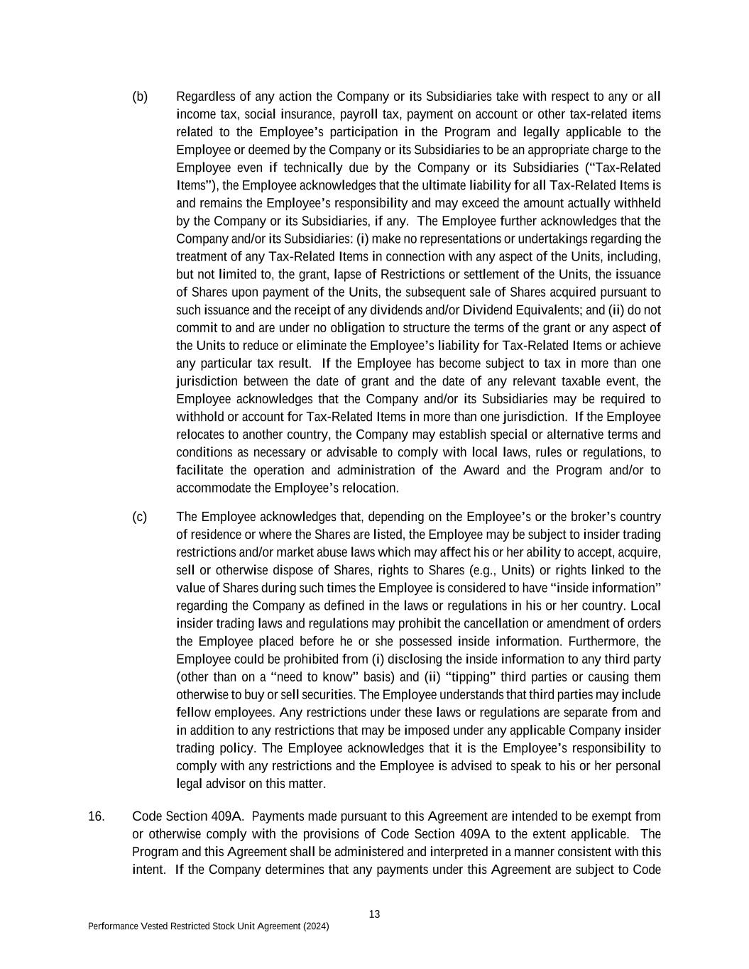 13 Performance Vested Restricted Stock Unit Agreement (2024) (b) Regardless of any action the Company or its Subsidiaries take with respect to any or all income tax, social insurance, payroll tax, payment on account or other tax-related items related to the Employee’s participation in the Program and legally applicable to the Employee or deemed by the Company or its Subsidiaries to be an appropriate charge to the Employee even if technically due by the Company or its Subsidiaries (“Tax-Related Items”), the Employee acknowledges that the ultimate liability for all Tax-Related Items is and remains the Employee’s responsibility and may exceed the amount actually withheld by the Company or its Subsidiaries, if any. The Employee further acknowledges that the Company and/or its Subsidiaries: (i) make no representations or undertakings regarding the treatment of any Tax-Related Items in connection with any aspect of the Units, including, but not limited to, the grant, lapse of Restrictions or settlement of the Units, the issuance of Shares upon payment of the Units, the subsequent sale of Shares acquired pursuant to such issuance and the receipt of any dividends and/or Dividend Equivalents; and (ii) do not commit to and are under no obligation to structure the terms of the grant or any aspect of the Units to reduce or eliminate the Employee’s liability for Tax-Related Items or achieve any particular tax result. If the Employee has become subject to tax in more than one jurisdiction between the date of grant and the date of any relevant taxable event, the Employee acknowledges that the Company and/or its Subsidiaries may be required to withhold or account for Tax-Related Items in more than one jurisdiction. If the Employee relocates to another country, the Company may establish special or alternative terms and conditions as necessary or advisable to comply with local laws, rules or regulations, to facilitate the operation and administration of the Award and the Program and/or to accommodate the Employee’s relocation. (c) The Employee acknowledges that, depending on the Employee’s or the broker’s country of residence or where the Shares are listed, the Employee may be subject to insider trading restrictions and/or market abuse laws which may affect his or her ability to accept, acquire, sell or otherwise dispose of Shares, rights to Shares (e.g., Units) or rights linked to the value of Shares during such times the Employee is considered to have “inside information” regarding the Company as defined in the laws or regulations in his or her country. Local insider trading laws and regulations may prohibit the cancellation or amendment of orders the Employee placed before he or she possessed inside information. Furthermore, the Employee could be prohibited from (i) disclosing the inside information to any third party (other than on a “need to know” basis) and (ii) “tipping” third parties or causing them otherwise to buy or sell securities. The Employee understands that third parties may include fellow employees. Any restrictions under these laws or regulations are separate from and in addition to any restrictions that may be imposed under any applicable Company insider trading policy. The Employee acknowledges that it is the Employee’s responsibility to comply with any restrictions and the Employee is advised to speak to his or her personal legal advisor on this matter. 16. Code Section 409A. Payments made pursuant to this Agreement are intended to be exempt from or otherwise comply with the provisions of Code Section 409A to the extent applicable. The Program and this Agreement shall be administered and interpreted in a manner consistent with this intent. If the Company determines that any payments under this Agreement are subject to Code