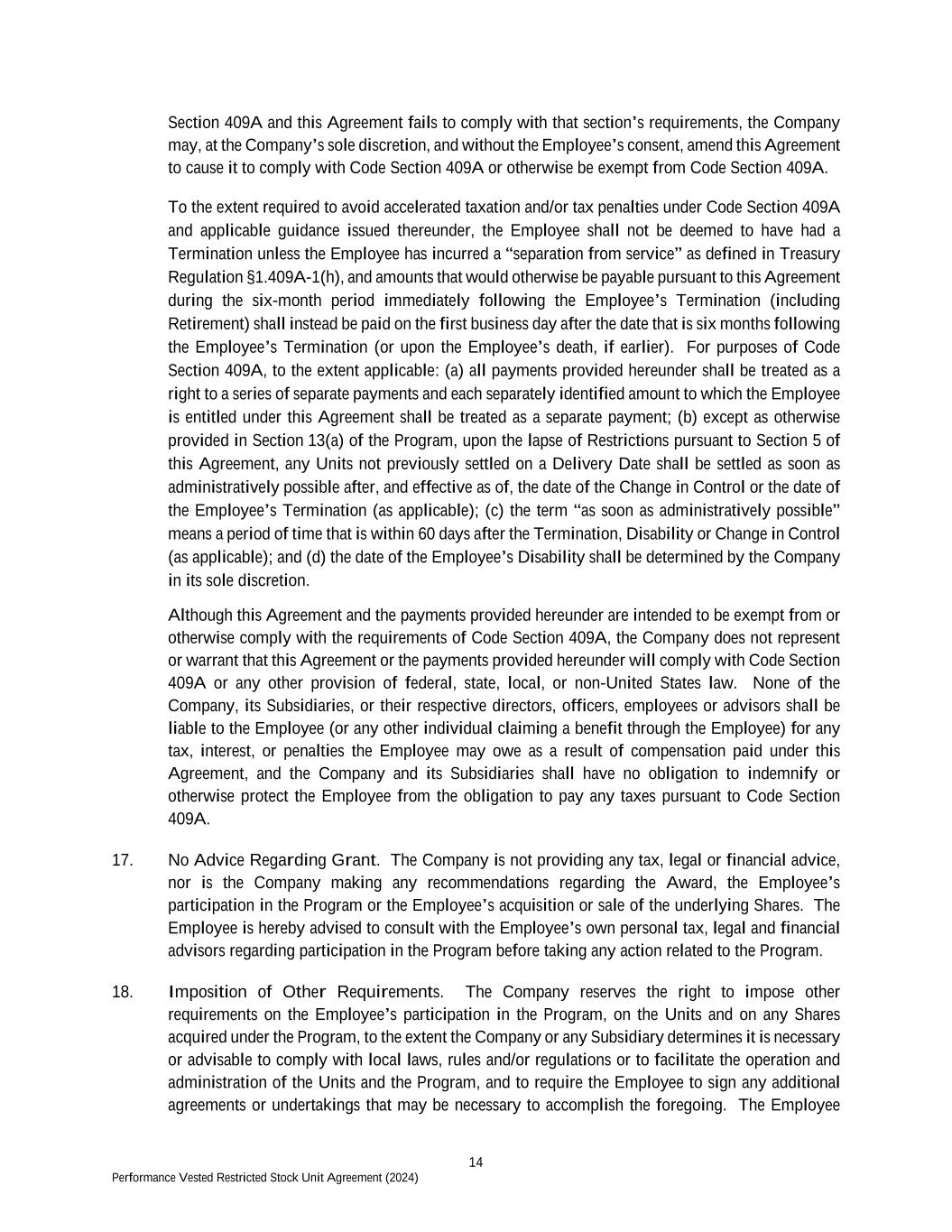 14 Performance Vested Restricted Stock Unit Agreement (2024) Section 409A and this Agreement fails to comply with that section’s requirements, the Company may, at the Company’s sole discretion, and without the Employee’s consent, amend this Agreement to cause it to comply with Code Section 409A or otherwise be exempt from Code Section 409A. To the extent required to avoid accelerated taxation and/or tax penalties under Code Section 409A and applicable guidance issued thereunder, the Employee shall not be deemed to have had a Termination unless the Employee has incurred a “separation from service” as defined in Treasury Regulation §1.409A-1(h), and amounts that would otherwise be payable pursuant to this Agreement during the six-month period immediately following the Employee’s Termination (including Retirement) shall instead be paid on the first business day after the date that is six months following the Employee’s Termination (or upon the Employee’s death, if earlier). For purposes of Code Section 409A, to the extent applicable: (a) all payments provided hereunder shall be treated as a right to a series of separate payments and each separately identified amount to which the Employee is entitled under this Agreement shall be treated as a separate payment; (b) except as otherwise provided in Section 13(a) of the Program, upon the lapse of Restrictions pursuant to Section 5 of this Agreement, any Units not previously settled on a Delivery Date shall be settled as soon as administratively possible after, and effective as of, the date of the Change in Control or the date of the Employee’s Termination (as applicable); (c) the term “as soon as administratively possible” means a period of time that is within 60 days after the Termination, Disability or Change in Control (as applicable); and (d) the date of the Employee’s Disability shall be determined by the Company in its sole discretion. Although this Agreement and the payments provided hereunder are intended to be exempt from or otherwise comply with the requirements of Code Section 409A, the Company does not represent or warrant that this Agreement or the payments provided hereunder will comply with Code Section 409A or any other provision of federal, state, local, or non-United States law. None of the Company, its Subsidiaries, or their respective directors, officers, employees or advisors shall be liable to the Employee (or any other individual claiming a benefit through the Employee) for any tax, interest, or penalties the Employee may owe as a result of compensation paid under this Agreement, and the Company and its Subsidiaries shall have no obligation to indemnify or otherwise protect the Employee from the obligation to pay any taxes pursuant to Code Section 409A. 17. No Advice Regarding Grant. The Company is not providing any tax, legal or financial advice, nor is the Company making any recommendations regarding the Award, the Employee’s participation in the Program or the Employee’s acquisition or sale of the underlying Shares. The Employee is hereby advised to consult with the Employee’s own personal tax, legal and financial advisors regarding participation in the Program before taking any action related to the Program. 18. Imposition of Other Requirements. The Company reserves the right to impose other requirements on the Employee’s participation in the Program, on the Units and on any Shares acquired under the Program, to the extent the Company or any Subsidiary determines it is necessary or advisable to comply with local laws, rules and/or regulations or to facilitate the operation and administration of the Units and the Program, and to require the Employee to sign any additional agreements or undertakings that may be necessary to accomplish the foregoing. The Employee