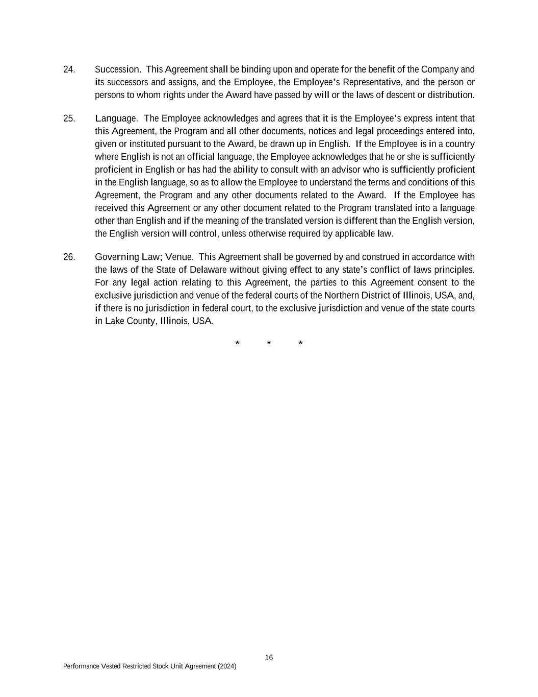 16 Performance Vested Restricted Stock Unit Agreement (2024) 24. Succession. This Agreement shall be binding upon and operate for the benefit of the Company and its successors and assigns, and the Employee, the Employee’s Representative, and the person or persons to whom rights under the Award have passed by will or the laws of descent or distribution. 25. Language. The Employee acknowledges and agrees that it is the Employee’s express intent that this Agreement, the Program and all other documents, notices and legal proceedings entered into, given or instituted pursuant to the Award, be drawn up in English. If the Employee is in a country where English is not an official language, the Employee acknowledges that he or she is sufficiently proficient in English or has had the ability to consult with an advisor who is sufficiently proficient in the English language, so as to allow the Employee to understand the terms and conditions of this Agreement, the Program and any other documents related to the Award. If the Employee has received this Agreement or any other document related to the Program translated into a language other than English and if the meaning of the translated version is different than the English version, the English version will control, unless otherwise required by applicable law. 26. Governing Law; Venue. This Agreement shall be governed by and construed in accordance with the laws of the State of Delaware without giving effect to any state’s conflict of laws principles. For any legal action relating to this Agreement, the parties to this Agreement consent to the exclusive jurisdiction and venue of the federal courts of the Northern District of Illinois, USA, and, if there is no jurisdiction in federal court, to the exclusive jurisdiction and venue of the state courts in Lake County, Illinois, USA. * * *