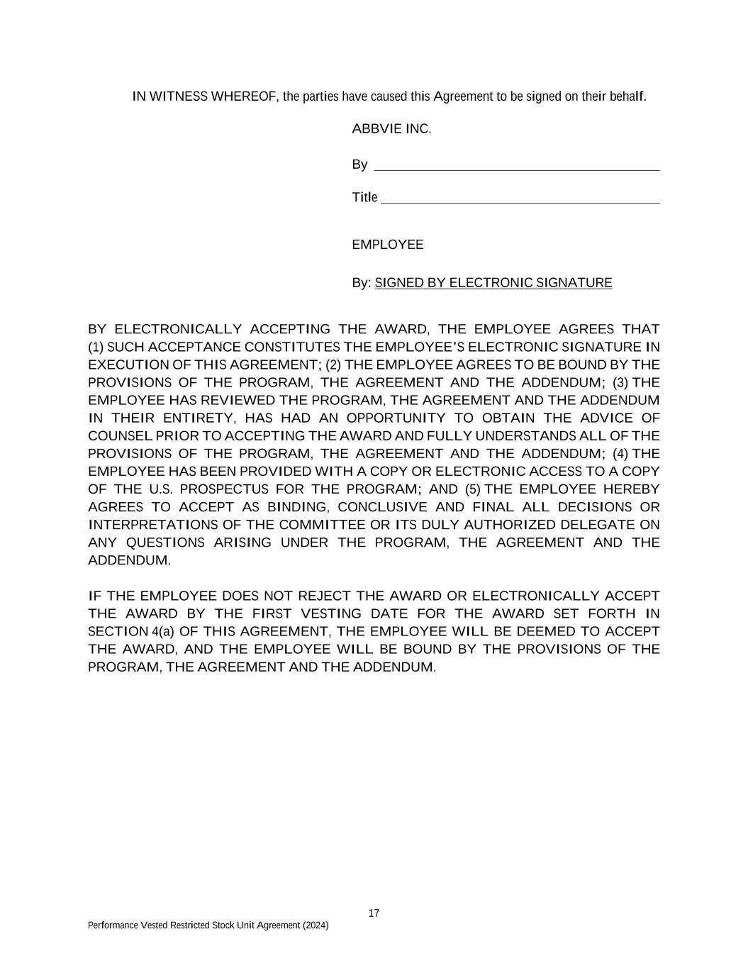 17 Performance Vested Restricted Stock Unit Agreement (2024) IN WITNESS WHEREOF, the parties have caused this Agreement to be signed on their behalf. ABBVIE INC. By Title EMPLOYEE By: SIGNED BY ELECTRONIC SIGNATURE BY ELECTRONICALLY ACCEPTING THE AWARD, THE EMPLOYEE AGREES THAT (1) SUCH ACCEPTANCE CONSTITUTES THE EMPLOYEE’S ELECTRONIC SIGNATURE IN EXECUTION OF THIS AGREEMENT; (2) THE EMPLOYEE AGREES TO BE BOUND BY THE PROVISIONS OF THE PROGRAM, THE AGREEMENT AND THE ADDENDUM; (3) THE EMPLOYEE HAS REVIEWED THE PROGRAM, THE AGREEMENT AND THE ADDENDUM IN THEIR ENTIRETY, HAS HAD AN OPPORTUNITY TO OBTAIN THE ADVICE OF COUNSEL PRIOR TO ACCEPTING THE AWARD AND FULLY UNDERSTANDS ALL OF THE PROVISIONS OF THE PROGRAM, THE AGREEMENT AND THE ADDENDUM; (4) THE EMPLOYEE HAS BEEN PROVIDED WITH A COPY OR ELECTRONIC ACCESS TO A COPY OF THE U.S. PROSPECTUS FOR THE PROGRAM; AND (5) THE EMPLOYEE HEREBY AGREES TO ACCEPT AS BINDING, CONCLUSIVE AND FINAL ALL DECISIONS OR INTERPRETATIONS OF THE COMMITTEE OR ITS DULY AUTHORIZED DELEGATE ON ANY QUESTIONS ARISING UNDER THE PROGRAM, THE AGREEMENT AND THE ADDENDUM. IF THE EMPLOYEE DOES NOT REJECT THE AWARD OR ELECTRONICALLY ACCEPT THE AWARD BY THE FIRST VESTING DATE FOR THE AWARD SET FORTH IN SECTION 4(a) OF THIS AGREEMENT, THE EMPLOYEE WILL BE DEEMED TO ACCEPT THE AWARD, AND THE EMPLOYEE WILL BE BOUND BY THE PROVISIONS OF THE PROGRAM, THE AGREEMENT AND THE ADDENDUM.