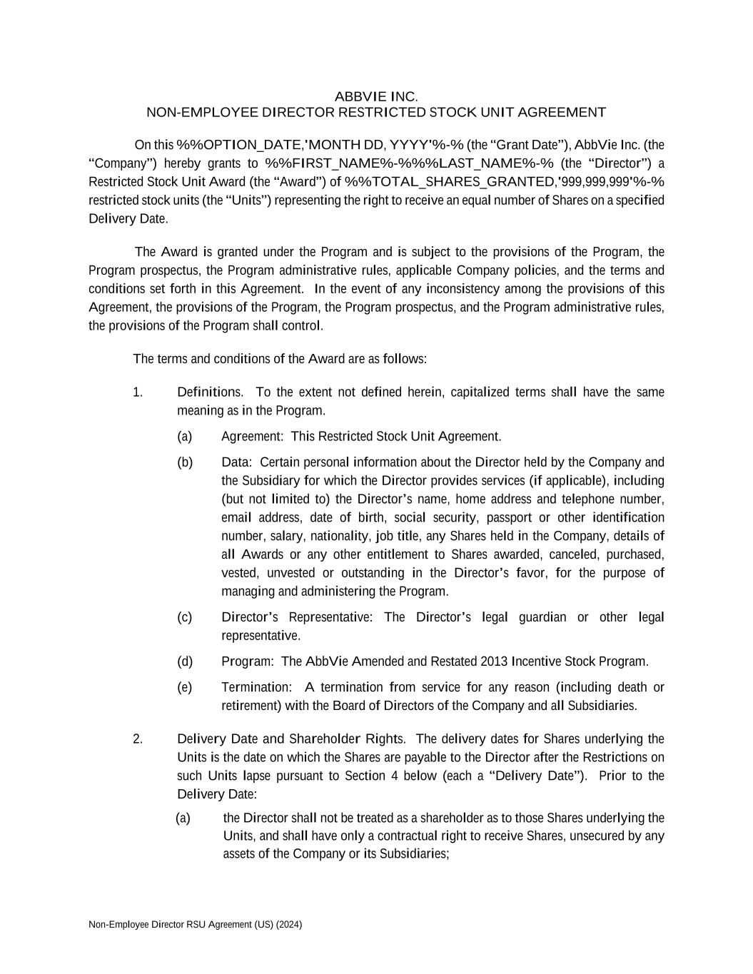 Non-Employee Director RSU Agreement (US) (2024) ABBVIE INC. NON-EMPLOYEE DIRECTOR RESTRICTED STOCK UNIT AGREEMENT On this %%OPTION_DATE,'MONTH DD, YYYY'%-% (the “Grant Date”), AbbVie Inc. (the “Company”) hereby grants to %%FIRST_NAME%-%%%LAST_NAME%-% (the “Director”) a Restricted Stock Unit Award (the “Award”) of %%TOTAL_SHARES_GRANTED,'999,999,999'%-% restricted stock units (the “Units”) representing the right to receive an equal number of Shares on a specified Delivery Date. The Award is granted under the Program and is subject to the provisions of the Program, the Program prospectus, the Program administrative rules, applicable Company policies, and the terms and conditions set forth in this Agreement. In the event of any inconsistency among the provisions of this Agreement, the provisions of the Program, the Program prospectus, and the Program administrative rules, the provisions of the Program shall control. The terms and conditions of the Award are as follows: 1. Definitions. To the extent not defined herein, capitalized terms shall have the same meaning as in the Program. (a) Agreement: This Restricted Stock Unit Agreement. (b) Data: Certain personal information about the Director held by the Company and the Subsidiary for which the Director provides services (if applicable), including (but not limited to) the Director’s name, home address and telephone number, email address, date of birth, social security, passport or other identification number, salary, nationality, job title, any Shares held in the Company, details of all Awards or any other entitlement to Shares awarded, canceled, purchased, vested, unvested or outstanding in the Director’s favor, for the purpose of managing and administering the Program. (c) Director’s Representative: The Director’s legal guardian or other legal representative. (d) Program: The AbbVie Amended and Restated 2013 Incentive Stock Program. (e) Termination: A termination from service for any reason (including death or retirement) with the Board of Directors of the Company and all Subsidiaries. 2. Delivery Date and Shareholder Rights. The delivery dates for Shares underlying the Units is the date on which the Shares are payable to the Director after the Restrictions on such Units lapse pursuant to Section 4 below (each a “Delivery Date”). Prior to the Delivery Date: (a) the Director shall not be treated as a shareholder as to those Shares underlying the Units, and shall have only a contractual right to receive Shares, unsecured by any assets of the Company or its Subsidiaries;