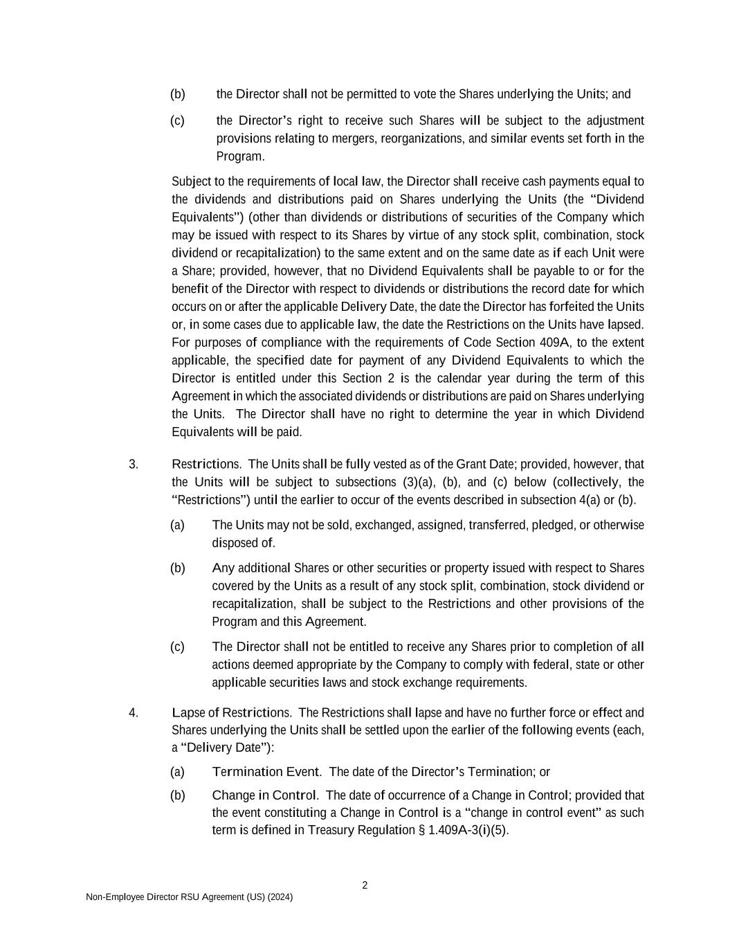 2 Non-Employee Director RSU Agreement (US) (2024) (b) the Director shall not be permitted to vote the Shares underlying the Units; and (c) the Director’s right to receive such Shares will be subject to the adjustment provisions relating to mergers, reorganizations, and similar events set forth in the Program. Subject to the requirements of local law, the Director shall receive cash payments equal to the dividends and distributions paid on Shares underlying the Units (the “Dividend Equivalents”) (other than dividends or distributions of securities of the Company which may be issued with respect to its Shares by virtue of any stock split, combination, stock dividend or recapitalization) to the same extent and on the same date as if each Unit were a Share; provided, however, that no Dividend Equivalents shall be payable to or for the benefit of the Director with respect to dividends or distributions the record date for which occurs on or after the applicable Delivery Date, the date the Director has forfeited the Units or, in some cases due to applicable law, the date the Restrictions on the Units have lapsed. For purposes of compliance with the requirements of Code Section 409A, to the extent applicable, the specified date for payment of any Dividend Equivalents to which the Director is entitled under this Section 2 is the calendar year during the term of this Agreement in which the associated dividends or distributions are paid on Shares underlying the Units. The Director shall have no right to determine the year in which Dividend Equivalents will be paid. 3. Restrictions. The Units shall be fully vested as of the Grant Date; provided, however, that the Units will be subject to subsections (3)(a), (b), and (c) below (collectively, the “Restrictions”) until the earlier to occur of the events described in subsection 4(a) or (b). (a) The Units may not be sold, exchanged, assigned, transferred, pledged, or otherwise disposed of. (b) Any additional Shares or other securities or property issued with respect to Shares covered by the Units as a result of any stock split, combination, stock dividend or recapitalization, shall be subject to the Restrictions and other provisions of the Program and this Agreement. (c) The Director shall not be entitled to receive any Shares prior to completion of all actions deemed appropriate by the Company to comply with federal, state or other applicable securities laws and stock exchange requirements. 4. Lapse of Restrictions. The Restrictions shall lapse and have no further force or effect and Shares underlying the Units shall be settled upon the earlier of the following events (each, a “Delivery Date”): (a) Termination Event. The date of the Director’s Termination; or (b) Change in Control. The date of occurrence of a Change in Control; provided that the event constituting a Change in Control is a “change in control event” as such term is defined in Treasury Regulation § 1.409A-3(i)(5).