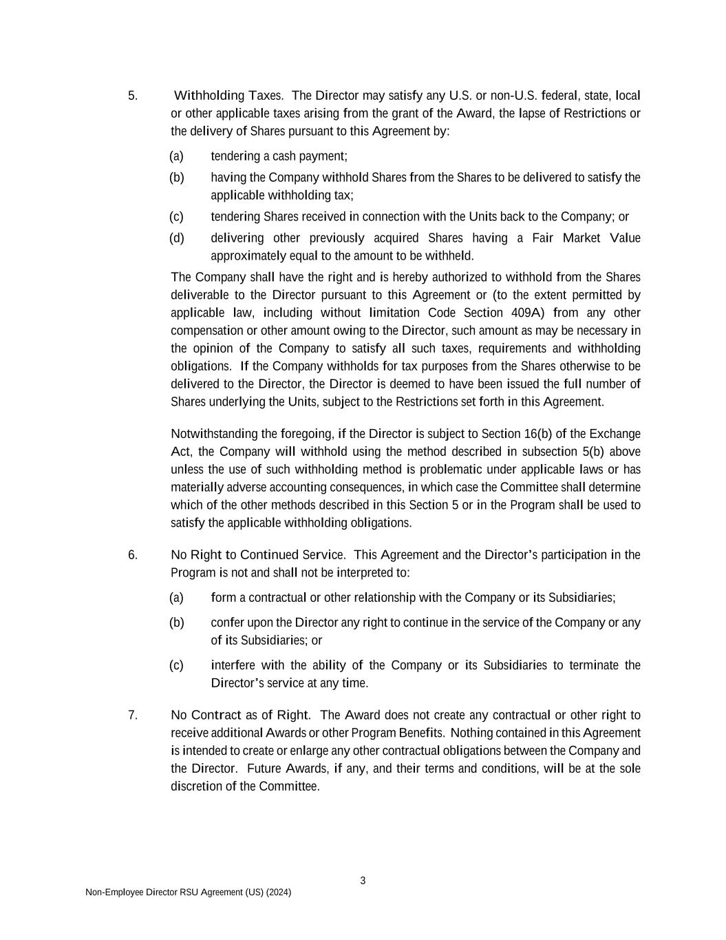 3 Non-Employee Director RSU Agreement (US) (2024) 5. Withholding Taxes. The Director may satisfy any U.S. or non-U.S. federal, state, local or other applicable taxes arising from the grant of the Award, the lapse of Restrictions or the delivery of Shares pursuant to this Agreement by: (a) tendering a cash payment; (b) having the Company withhold Shares from the Shares to be delivered to satisfy the applicable withholding tax; (c) tendering Shares received in connection with the Units back to the Company; or (d) delivering other previously acquired Shares having a Fair Market Value approximately equal to the amount to be withheld. The Company shall have the right and is hereby authorized to withhold from the Shares deliverable to the Director pursuant to this Agreement or (to the extent permitted by applicable law, including without limitation Code Section 409A) from any other compensation or other amount owing to the Director, such amount as may be necessary in the opinion of the Company to satisfy all such taxes, requirements and withholding obligations. If the Company withholds for tax purposes from the Shares otherwise to be delivered to the Director, the Director is deemed to have been issued the full number of Shares underlying the Units, subject to the Restrictions set forth in this Agreement. Notwithstanding the foregoing, if the Director is subject to Section 16(b) of the Exchange Act, the Company will withhold using the method described in subsection 5(b) above unless the use of such withholding method is problematic under applicable laws or has materially adverse accounting consequences, in which case the Committee shall determine which of the other methods described in this Section 5 or in the Program shall be used to satisfy the applicable withholding obligations. 6. No Right to Continued Service. This Agreement and the Director’s participation in the Program is not and shall not be interpreted to: (a) form a contractual or other relationship with the Company or its Subsidiaries; (b) confer upon the Director any right to continue in the service of the Company or any of its Subsidiaries; or (c) interfere with the ability of the Company or its Subsidiaries to terminate the Director’s service at any time. 7. No Contract as of Right. The Award does not create any contractual or other right to receive additional Awards or other Program Benefits. Nothing contained in this Agreement is intended to create or enlarge any other contractual obligations between the Company and the Director. Future Awards, if any, and their terms and conditions, will be at the sole discretion of the Committee.