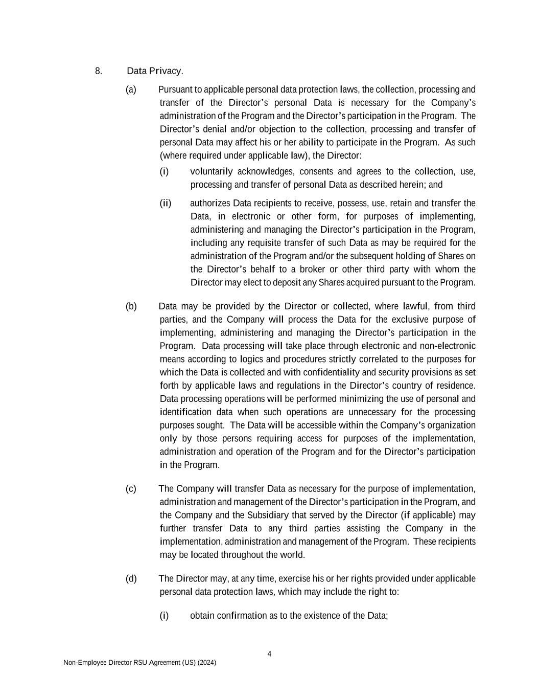 4 Non-Employee Director RSU Agreement (US) (2024) 8. Data Privacy. (a) Pursuant to applicable personal data protection laws, the collection, processing and transfer of the Director’s personal Data is necessary for the Company’s administration of the Program and the Director’s participation in the Program. The Director’s denial and/or objection to the collection, processing and transfer of personal Data may affect his or her ability to participate in the Program. As such (where required under applicable law), the Director: (i) voluntarily acknowledges, consents and agrees to the collection, use, processing and transfer of personal Data as described herein; and (ii) authorizes Data recipients to receive, possess, use, retain and transfer the Data, in electronic or other form, for purposes of implementing, administering and managing the Director’s participation in the Program, including any requisite transfer of such Data as may be required for the administration of the Program and/or the subsequent holding of Shares on the Director’s behalf to a broker or other third party with whom the Director may elect to deposit any Shares acquired pursuant to the Program. (b) Data may be provided by the Director or collected, where lawful, from third parties, and the Company will process the Data for the exclusive purpose of implementing, administering and managing the Director’s participation in the Program. Data processing will take place through electronic and non-electronic means according to logics and procedures strictly correlated to the purposes for which the Data is collected and with confidentiality and security provisions as set forth by applicable laws and regulations in the Director’s country of residence. Data processing operations will be performed minimizing the use of personal and identification data when such operations are unnecessary for the processing purposes sought. The Data will be accessible within the Company’s organization only by those persons requiring access for purposes of the implementation, administration and operation of the Program and for the Director’s participation in the Program. (c) The Company will transfer Data as necessary for the purpose of implementation, administration and management of the Director’s participation in the Program, and the Company and the Subsidiary that served by the Director (if applicable) may further transfer Data to any third parties assisting the Company in the implementation, administration and management of the Program. These recipients may be located throughout the world. (d) The Director may, at any time, exercise his or her rights provided under applicable personal data protection laws, which may include the right to: (i) obtain confirmation as to the existence of the Data;