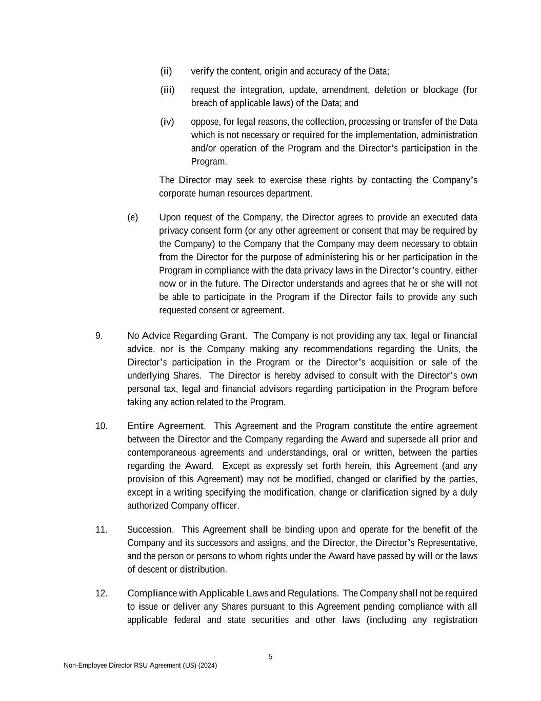 5 Non-Employee Director RSU Agreement (US) (2024) (ii) verify the content, origin and accuracy of the Data; (iii) request the integration, update, amendment, deletion or blockage (for breach of applicable laws) of the Data; and (iv) oppose, for legal reasons, the collection, processing or transfer of the Data which is not necessary or required for the implementation, administration and/or operation of the Program and the Director’s participation in the Program. The Director may seek to exercise these rights by contacting the Company’s corporate human resources department. (e) Upon request of the Company, the Director agrees to provide an executed data privacy consent form (or any other agreement or consent that may be required by the Company) to the Company that the Company may deem necessary to obtain from the Director for the purpose of administering his or her participation in the Program in compliance with the data privacy laws in the Director’s country, either now or in the future. The Director understands and agrees that he or she will not be able to participate in the Program if the Director fails to provide any such requested consent or agreement. 9. No Advice Regarding Grant. The Company is not providing any tax, legal or financial advice, nor is the Company making any recommendations regarding the Units, the Director’s participation in the Program or the Director’s acquisition or sale of the underlying Shares. The Director is hereby advised to consult with the Director’s own personal tax, legal and financial advisors regarding participation in the Program before taking any action related to the Program. 10. Entire Agreement. This Agreement and the Program constitute the entire agreement between the Director and the Company regarding the Award and supersede all prior and contemporaneous agreements and understandings, oral or written, between the parties regarding the Award. Except as expressly set forth herein, this Agreement (and any provision of this Agreement) may not be modified, changed or clarified by the parties, except in a writing specifying the modification, change or clarification signed by a duly authorized Company officer. 11. Succession. This Agreement shall be binding upon and operate for the benefit of the Company and its successors and assigns, and the Director, the Director’s Representative, and the person or persons to whom rights under the Award have passed by will or the laws of descent or distribution. 12. Compliance with Applicable Laws and Regulations. The Company shall not be required to issue or deliver any Shares pursuant to this Agreement pending compliance with all applicable federal and state securities and other laws (including any registration