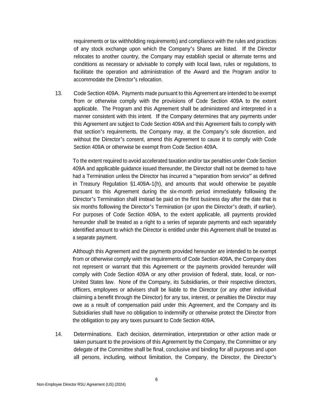 6 Non-Employee Director RSU Agreement (US) (2024) requirements or tax withholding requirements) and compliance with the rules and practices of any stock exchange upon which the Company’s Shares are listed. If the Director relocates to another country, the Company may establish special or alternate terms and conditions as necessary or advisable to comply with local laws, rules or regulations, to facilitate the operation and administration of the Award and the Program and/or to accommodate the Director’s relocation. 13. Code Section 409A. Payments made pursuant to this Agreement are intended to be exempt from or otherwise comply with the provisions of Code Section 409A to the extent applicable. The Program and this Agreement shall be administered and interpreted in a manner consistent with this intent. If the Company determines that any payments under this Agreement are subject to Code Section 409A and this Agreement fails to comply with that section’s requirements, the Company may, at the Company’s sole discretion, and without the Director’s consent, amend this Agreement to cause it to comply with Code Section 409A or otherwise be exempt from Code Section 409A. To the extent required to avoid accelerated taxation and/or tax penalties under Code Section 409A and applicable guidance issued thereunder, the Director shall not be deemed to have had a Termination unless the Director has incurred a “separation from service” as defined in Treasury Regulation §1.409A-1(h), and amounts that would otherwise be payable pursuant to this Agreement during the six-month period immediately following the Director’s Termination shall instead be paid on the first business day after the date that is six months following the Director’s Termination (or upon the Director’s death, if earlier). For purposes of Code Section 409A, to the extent applicable, all payments provided hereunder shall be treated as a right to a series of separate payments and each separately identified amount to which the Director is entitled under this Agreement shall be treated as a separate payment. Although this Agreement and the payments provided hereunder are intended to be exempt from or otherwise comply with the requirements of Code Section 409A, the Company does not represent or warrant that this Agreement or the payments provided hereunder will comply with Code Section 409A or any other provision of federal, state, local, or non- United States law. None of the Company, its Subsidiaries, or their respective directors, officers, employees or advisers shall be liable to the Director (or any other individual claiming a benefit through the Director) for any tax, interest, or penalties the Director may owe as a result of compensation paid under this Agreement, and the Company and its Subsidiaries shall have no obligation to indemnify or otherwise protect the Director from the obligation to pay any taxes pursuant to Code Section 409A. 14. Determinations. Each decision, determination, interpretation or other action made or taken pursuant to the provisions of this Agreement by the Company, the Committee or any delegate of the Committee shall be final, conclusive and binding for all purposes and upon all persons, including, without limitation, the Company, the Director, the Director’s
