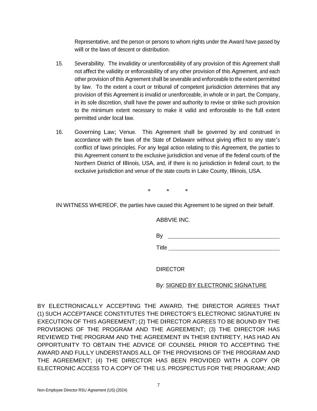 7 Non-Employee Director RSU Agreement (US) (2024) Representative, and the person or persons to whom rights under the Award have passed by will or the laws of descent or distribution. 15. Severability. The invalidity or unenforceability of any provision of this Agreement shall not affect the validity or enforceability of any other provision of this Agreement, and each other provision of this Agreement shall be severable and enforceable to the extent permitted by law. To the extent a court or tribunal of competent jurisdiction determines that any provision of this Agreement is invalid or unenforceable, in whole or in part, the Company, in its sole discretion, shall have the power and authority to revise or strike such provision to the minimum extent necessary to make it valid and enforceable to the full extent permitted under local law. 16. Governing Law; Venue. This Agreement shall be governed by and construed in accordance with the laws of the State of Delaware without giving effect to any state’s conflict of laws principles. For any legal action relating to this Agreement, the parties to this Agreement consent to the exclusive jurisdiction and venue of the federal courts of the Northern District of Illinois, USA, and, if there is no jurisdiction in federal court, to the exclusive jurisdiction and venue of the state courts in Lake County, Illinois, USA. * * * IN WITNESS WHEREOF, the parties have caused this Agreement to be signed on their behalf. ABBVIE INC. By Title DIRECTOR By: SIGNED BY ELECTRONIC SIGNATURE BY ELECTRONICALLY ACCEPTING THE AWARD, THE DIRECTOR AGREES THAT (1) SUCH ACCEPTANCE CONSTITUTES THE DIRECTOR’S ELECTRONIC SIGNATURE IN EXECUTION OF THIS AGREEMENT; (2) THE DIRECTOR AGREES TO BE BOUND BY THE PROVISIONS OF THE PROGRAM AND THE AGREEMENT; (3) THE DIRECTOR HAS REVIEWED THE PROGRAM AND THE AGREEMENT IN THEIR ENTIRETY, HAS HAD AN OPPORTUNITY TO OBTAIN THE ADVICE OF COUNSEL PRIOR TO ACCEPTING THE AWARD AND FULLY UNDERSTANDS ALL OF THE PROVISIONS OF THE PROGRAM AND THE AGREEMENT; (4) THE DIRECTOR HAS BEEN PROVIDED WITH A COPY OR ELECTRONIC ACCESS TO A COPY OF THE U.S. PROSPECTUS FOR THE PROGRAM; AND