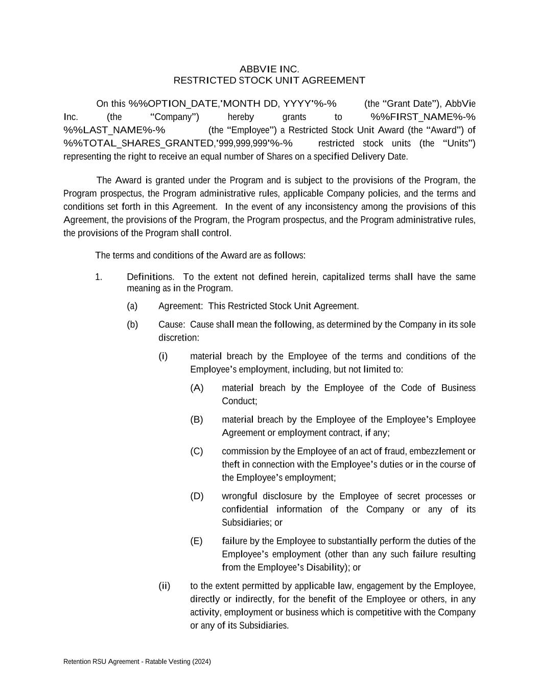 Retention RSU Agreement - Ratable Vesting (2024) ABBVIE INC. RESTRICTED STOCK UNIT AGREEMENT On this %%OPTION_DATE,'MONTH DD, YYYY'%-% (the “Grant Date”), AbbVie Inc. (the “Company”) hereby grants to %%FIRST_NAME%-% %%LAST_NAME%-% (the “Employee”) a Restricted Stock Unit Award (the “Award”) of %%TOTAL_SHARES_GRANTED,'999,999,999'%-% restricted stock units (the “Units”) representing the right to receive an equal number of Shares on a specified Delivery Date. The Award is granted under the Program and is subject to the provisions of the Program, the Program prospectus, the Program administrative rules, applicable Company policies, and the terms and conditions set forth in this Agreement. In the event of any inconsistency among the provisions of this Agreement, the provisions of the Program, the Program prospectus, and the Program administrative rules, the provisions of the Program shall control. The terms and conditions of the Award are as follows: 1. Definitions. To the extent not defined herein, capitalized terms shall have the same meaning as in the Program. (a) Agreement: This Restricted Stock Unit Agreement. (b) Cause: Cause shall mean the following, as determined by the Company in its sole discretion: (i) material breach by the Employee of the terms and conditions of the Employee’s employment, including, but not limited to: (A) material breach by the Employee of the Code of Business Conduct; (B) material breach by the Employee of the Employee’s Employee Agreement or employment contract, if any; (C) commission by the Employee of an act of fraud, embezzlement or theft in connection with the Employee’s duties or in the course of the Employee’s employment; (D) wrongful disclosure by the Employee of secret processes or confidential information of the Company or any of its Subsidiaries; or (E) failure by the Employee to substantially perform the duties of the Employee’s employment (other than any such failure resulting from the Employee’s Disability); or (ii) to the extent permitted by applicable law, engagement by the Employee, directly or indirectly, for the benefit of the Employee or others, in any activity, employment or business which is competitive with the Company or any of its Subsidiaries.