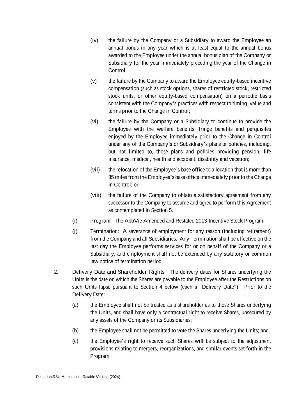 Retention RSU Agreement - Ratable Vesting (2024) (iv) the failure by the Company or a Subsidiary to award the Employee an annual bonus in any year which is at least equal to the annual bonus awarded to the Employee under the annual bonus plan of the Company or Subsidiary for the year immediately preceding the year of the Change in Control; (v) the failure by the Company to award the Employee equity-based incentive compensation (such as stock options, shares of restricted stock, restricted stock units, or other equity-based compensation) on a periodic basis consistent with the Company’s practices with respect to timing, value and terms prior to the Change in Control; (vi) the failure by the Company or a Subsidiary to continue to provide the Employee with the welfare benefits, fringe benefits and perquisites enjoyed by the Employee immediately prior to the Change in Control under any of the Company’s or Subsidiary’s plans or policies, including, but not limited to, those plans and policies providing pension, life insurance, medical, health and accident, disability and vacation; (vii) the relocation of the Employee’s base office to a location that is more than 35 miles from the Employee’s base office immediately prior to the Change in Control; or (viii) the failure of the Company to obtain a satisfactory agreement from any successor to the Company to assume and agree to perform this Agreement as contemplated in Section 5. (i) Program: The AbbVie Amended and Restated 2013 Incentive Stock Program. (j) Termination: A severance of employment for any reason (including retirement) from the Company and all Subsidiaries. Any Termination shall be effective on the last day the Employee performs services for or on behalf of the Company or a Subsidiary, and employment shall not be extended by any statutory or common law notice of termination period. 2. Delivery Date and Shareholder Rights. The delivery dates for Shares underlying the Units is the date on which the Shares are payable to the Employee after the Restrictions on such Units lapse pursuant to Section 4 below (each a “Delivery Date”). Prior to the Delivery Date: (a) the Employee shall not be treated as a shareholder as to those Shares underlying the Units, and shall have only a contractual right to receive Shares, unsecured by any assets of the Company or its Subsidiaries; (b) the Employee shall not be permitted to vote the Shares underlying the Units; and (c) the Employee’s right to receive such Shares will be subject to the adjustment provisions relating to mergers, reorganizations, and similar events set forth in the Program.
