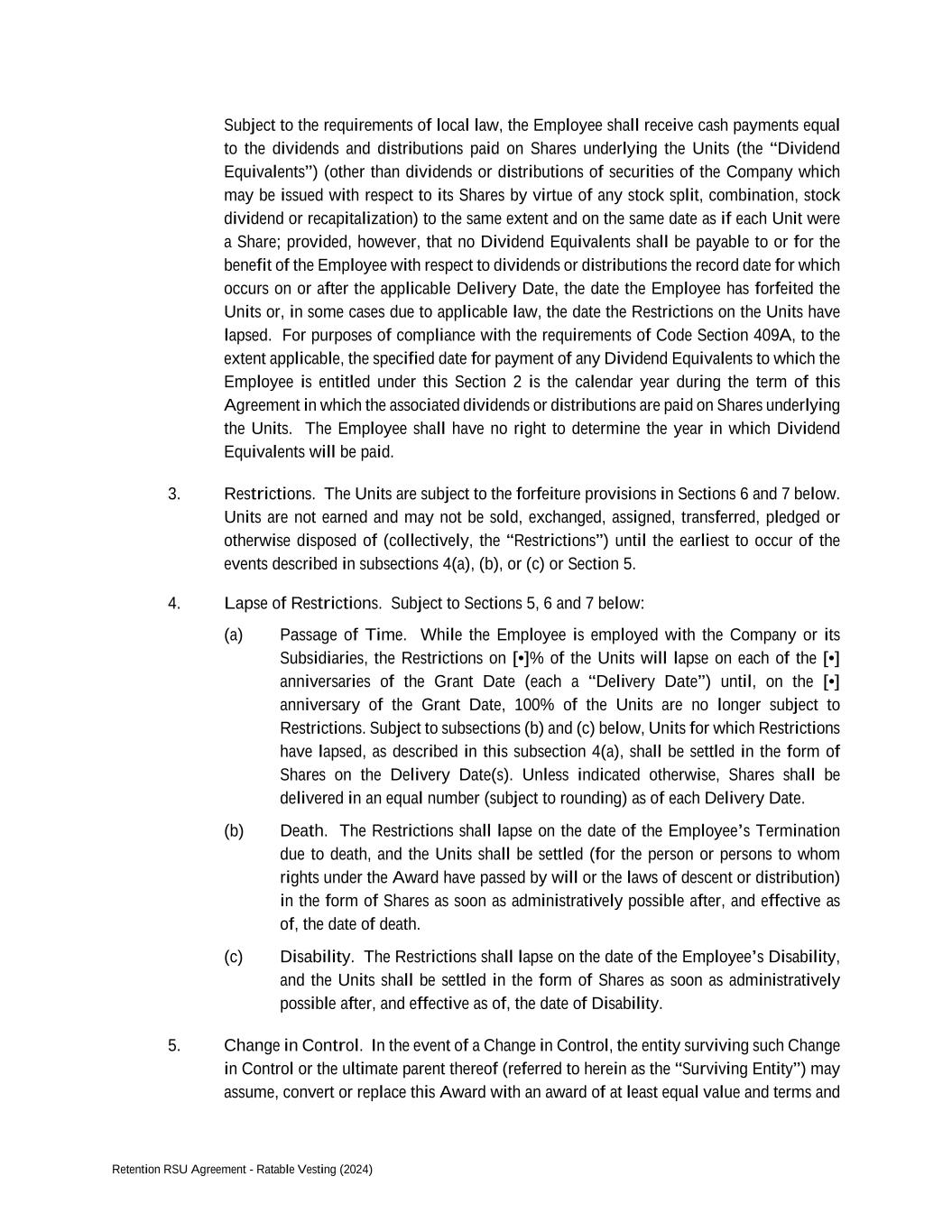 Retention RSU Agreement - Ratable Vesting (2024) Subject to the requirements of local law, the Employee shall receive cash payments equal to the dividends and distributions paid on Shares underlying the Units (the “Dividend Equivalents”) (other than dividends or distributions of securities of the Company which may be issued with respect to its Shares by virtue of any stock split, combination, stock dividend or recapitalization) to the same extent and on the same date as if each Unit were a Share; provided, however, that no Dividend Equivalents shall be payable to or for the benefit of the Employee with respect to dividends or distributions the record date for which occurs on or after the applicable Delivery Date, the date the Employee has forfeited the Units or, in some cases due to applicable law, the date the Restrictions on the Units have lapsed. For purposes of compliance with the requirements of Code Section 409A, to the extent applicable, the specified date for payment of any Dividend Equivalents to which the Employee is entitled under this Section 2 is the calendar year during the term of this Agreement in which the associated dividends or distributions are paid on Shares underlying the Units. The Employee shall have no right to determine the year in which Dividend Equivalents will be paid. 3. Restrictions. The Units are subject to the forfeiture provisions in Sections 6 and 7 below. Units are not earned and may not be sold, exchanged, assigned, transferred, pledged or otherwise disposed of (collectively, the “Restrictions”) until the earliest to occur of the events described in subsections 4(a), (b), or (c) or Section 5. 4. Lapse of Restrictions. Subject to Sections 5, 6 and 7 below: (a) Passage of Time. While the Employee is employed with the Company or its Subsidiaries, the Restrictions on [•]% of the Units will lapse on each of the [•] anniversaries of the Grant Date (each a “Delivery Date”) until, on the [•] anniversary of the Grant Date, 100% of the Units are no longer subject to Restrictions. Subject to subsections (b) and (c) below, Units for which Restrictions have lapsed, as described in this subsection 4(a), shall be settled in the form of Shares on the Delivery Date(s). Unless indicated otherwise, Shares shall be delivered in an equal number (subject to rounding) as of each Delivery Date. (b) Death. The Restrictions shall lapse on the date of the Employee’s Termination due to death, and the Units shall be settled (for the person or persons to whom rights under the Award have passed by will or the laws of descent or distribution) in the form of Shares as soon as administratively possible after, and effective as of, the date of death. (c) Disability. The Restrictions shall lapse on the date of the Employee’s Disability, and the Units shall be settled in the form of Shares as soon as administratively possible after, and effective as of, the date of Disability. 5. Change in Control. In the event of a Change in Control, the entity surviving such Change in Control or the ultimate parent thereof (referred to herein as the “Surviving Entity”) may assume, convert or replace this Award with an award of at least equal value and terms and